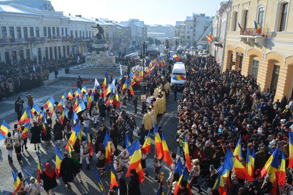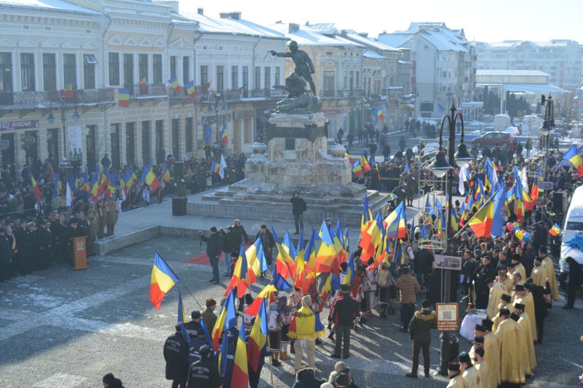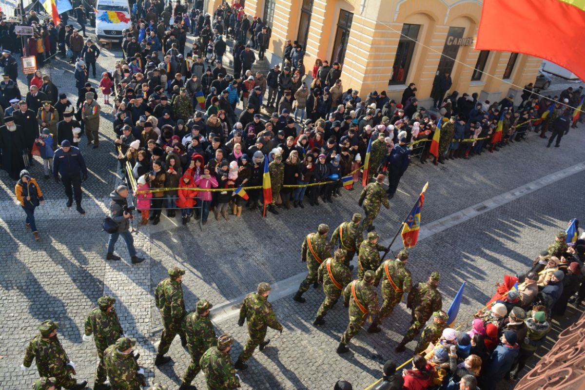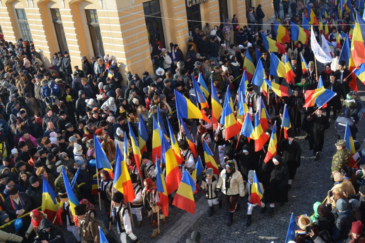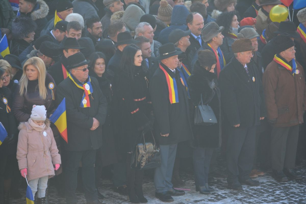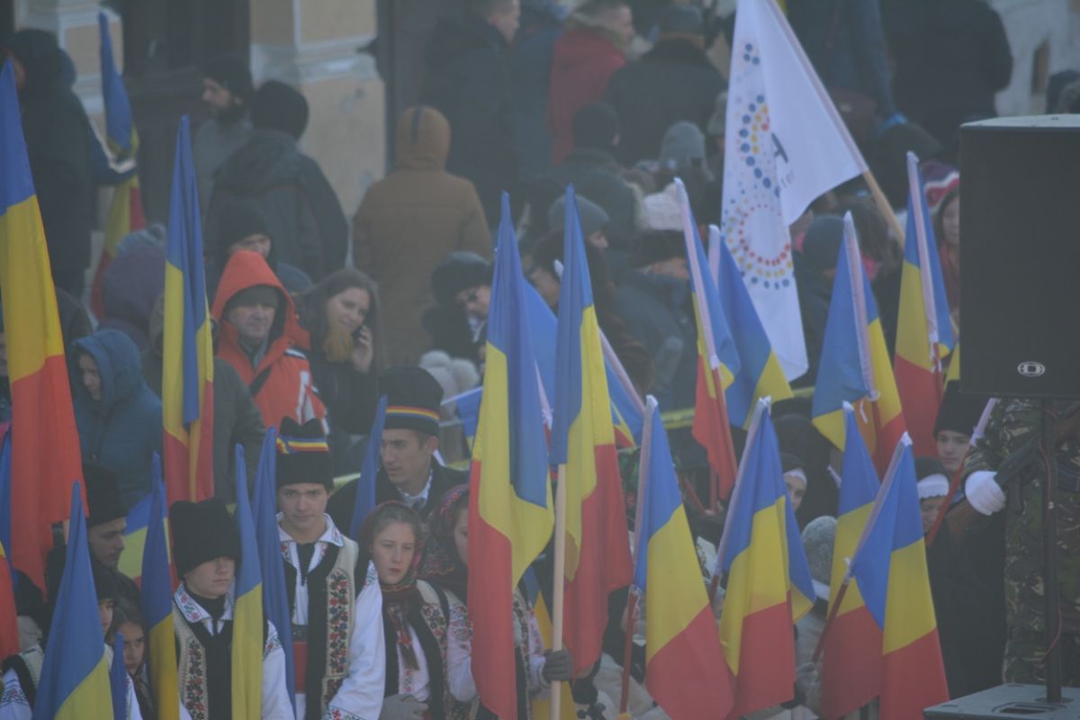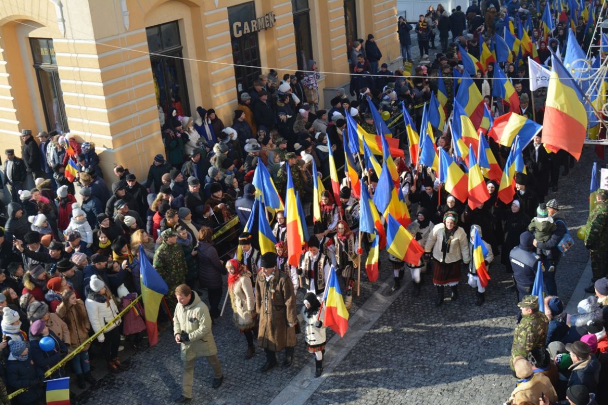 Prefectul Dan Şlincu a primit onorul de la Garda Militară, după care o mulţime de oameni s-a revărsat spre Piaţa 1 Decembrie 1918 agitând sute de drapele naţionale.