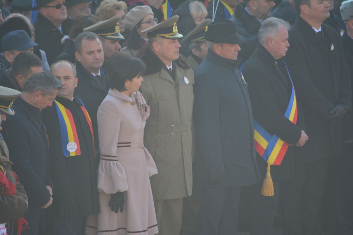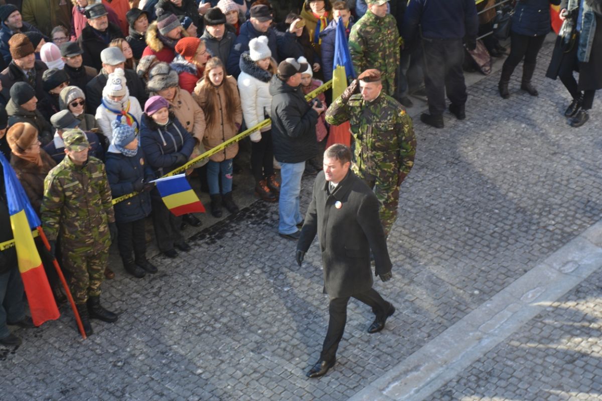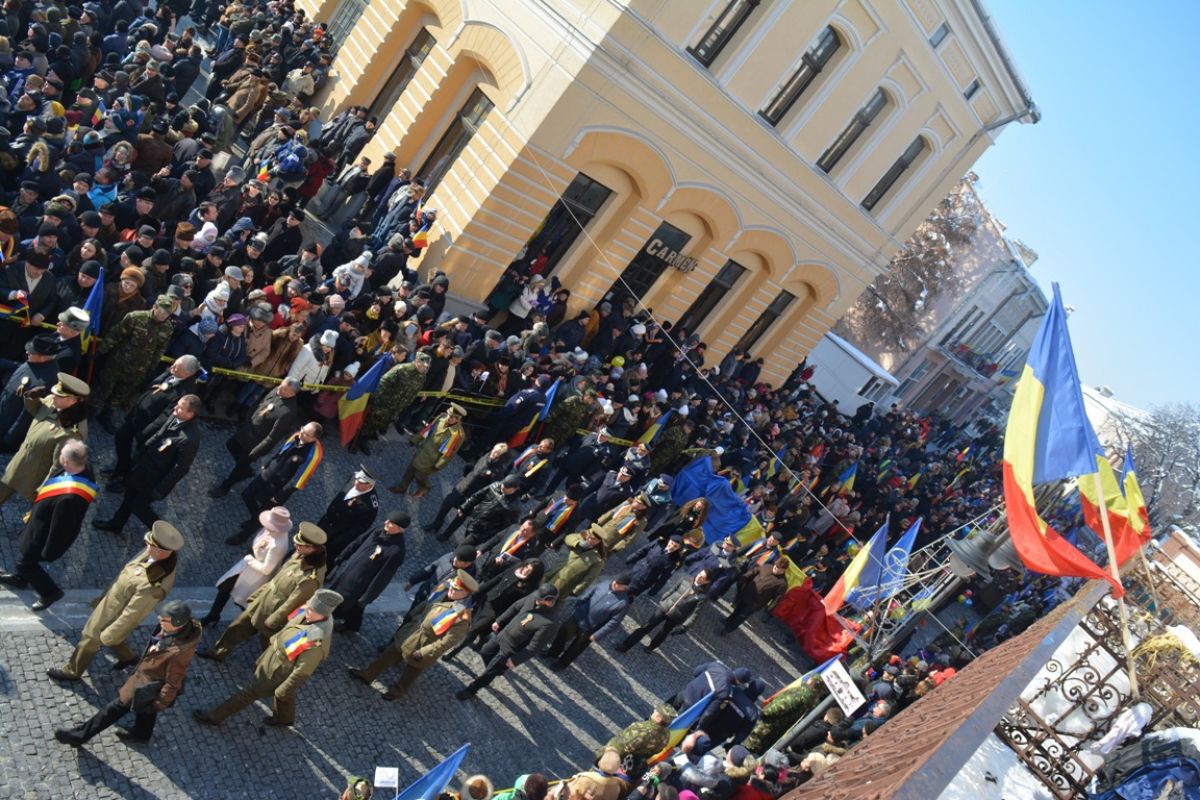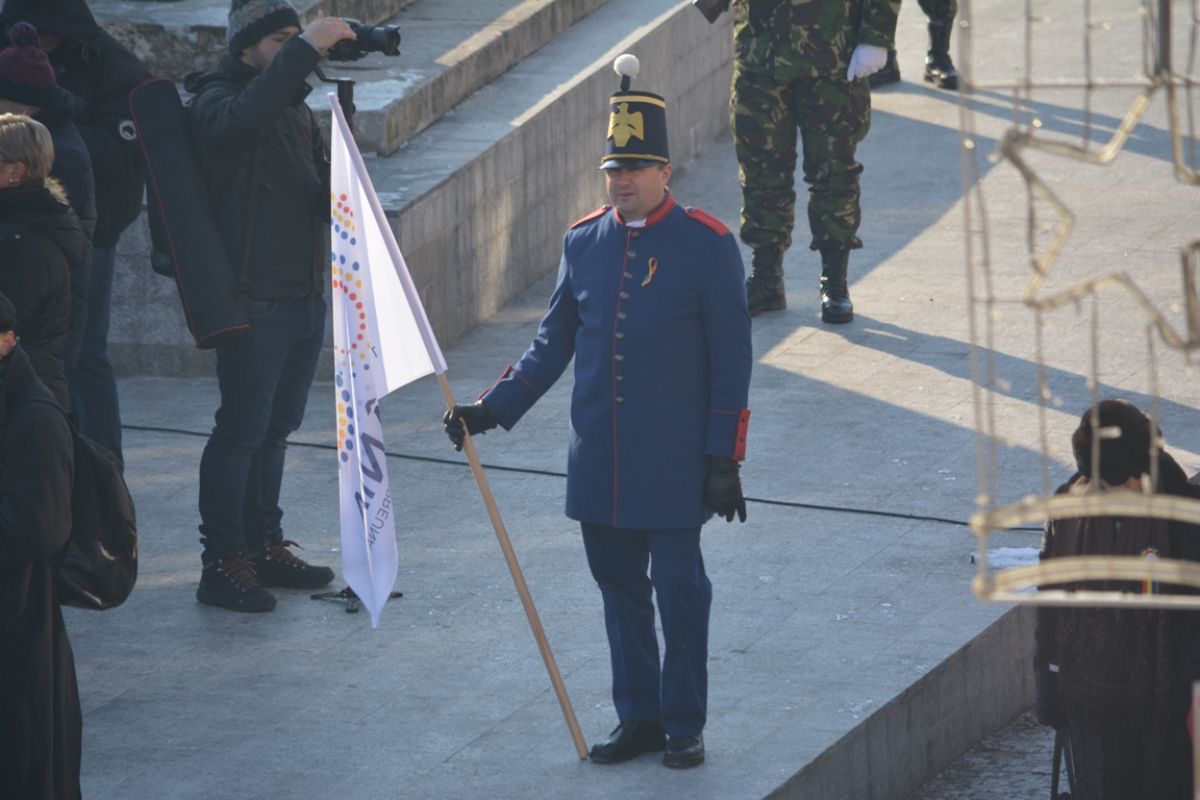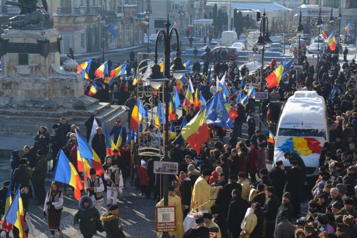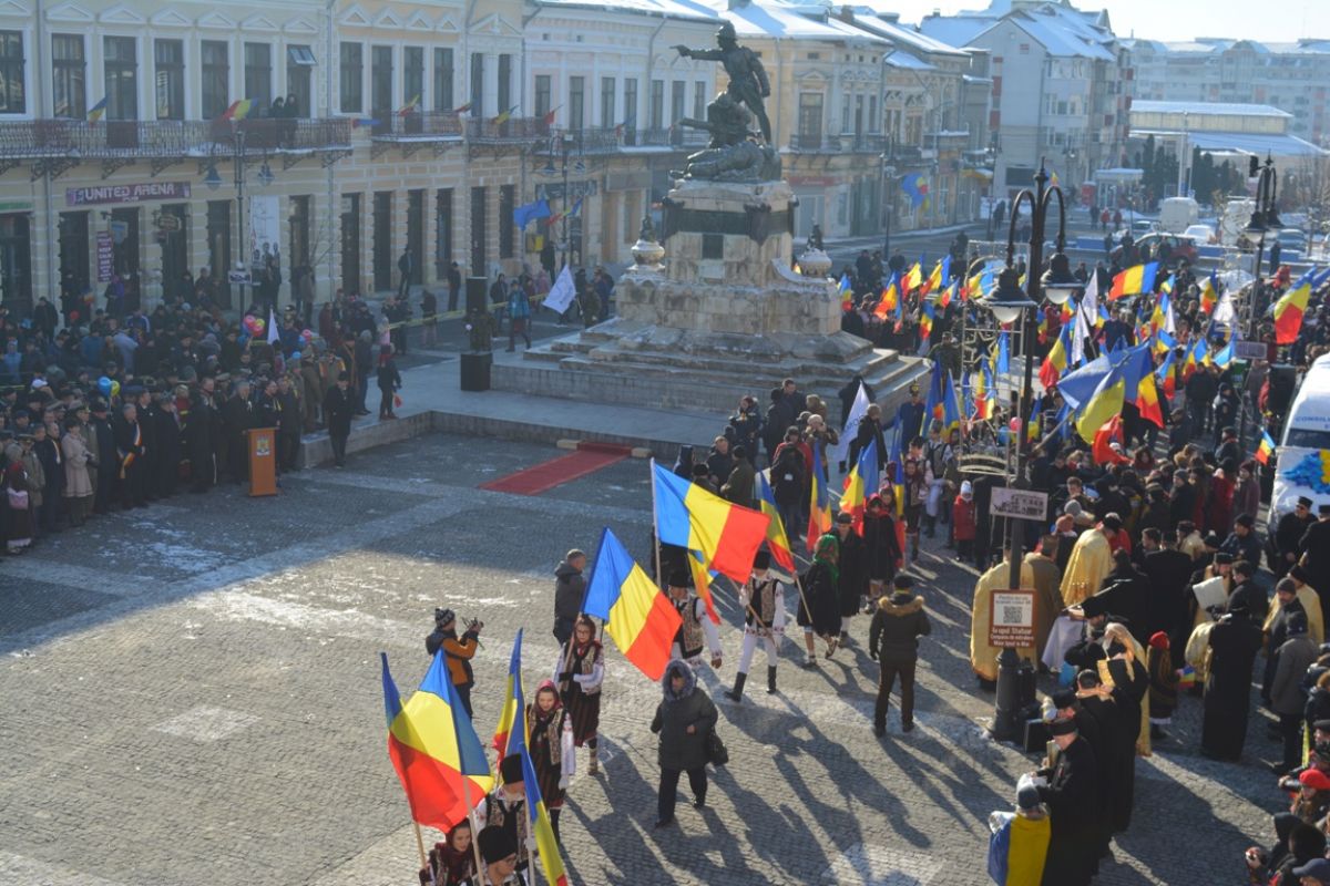 Prefectul Dan Şlincu a primit onorul de la Garda Militară, după care o mulţime de oameni s-a revărsat spre Piaţa 1 Decembrie 1918 agitând sute de drapele naţionale.