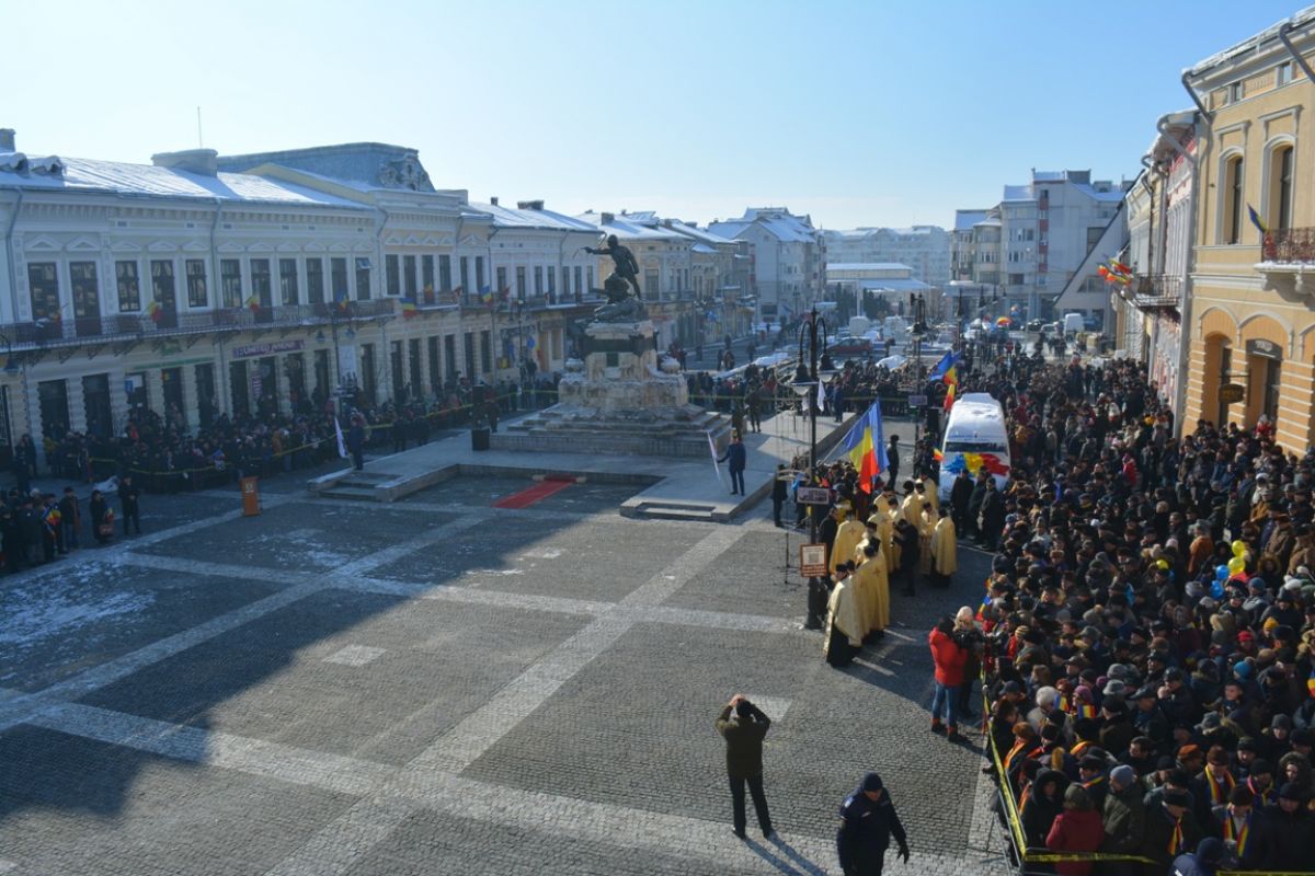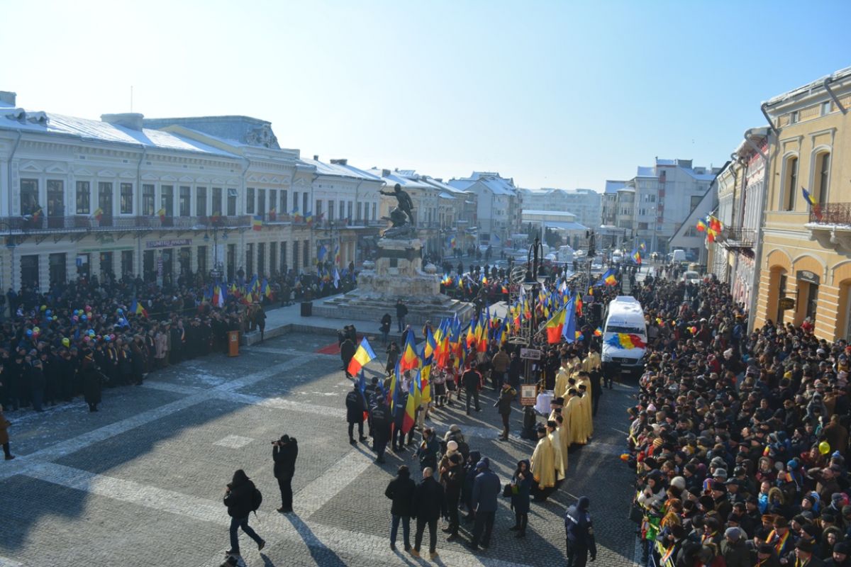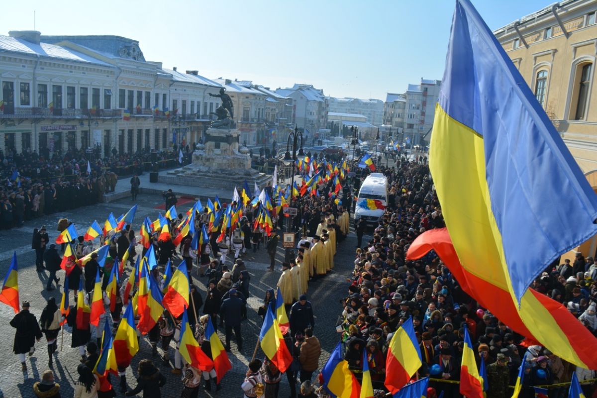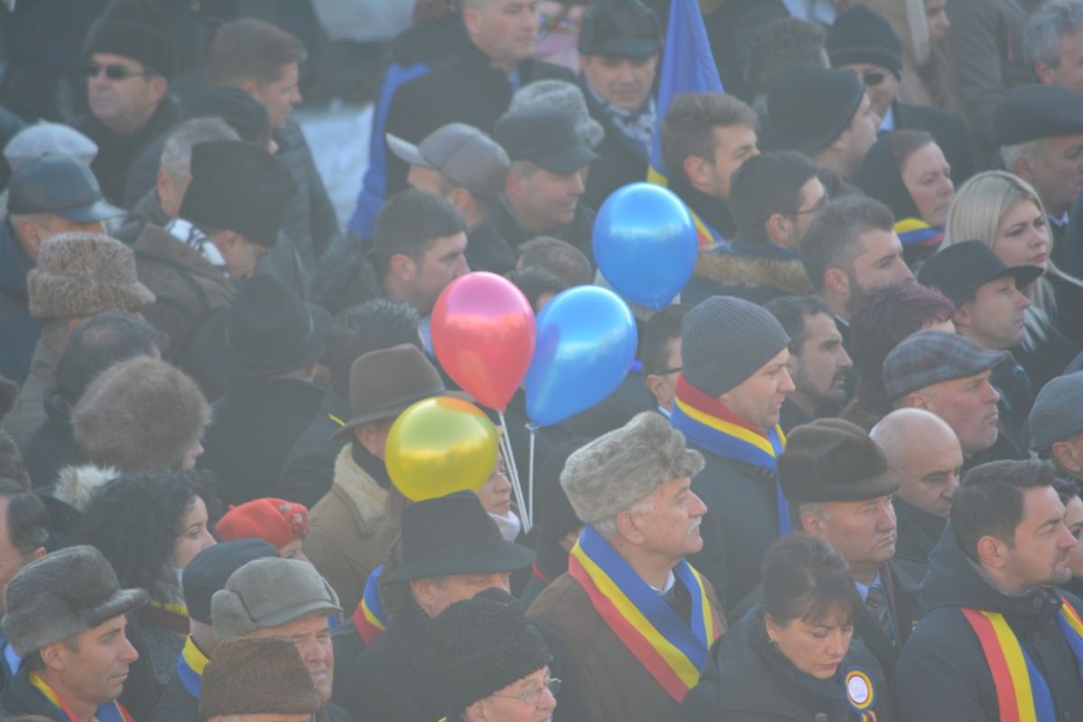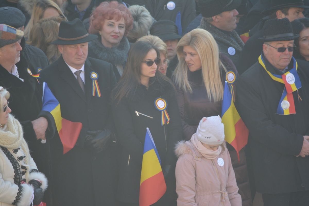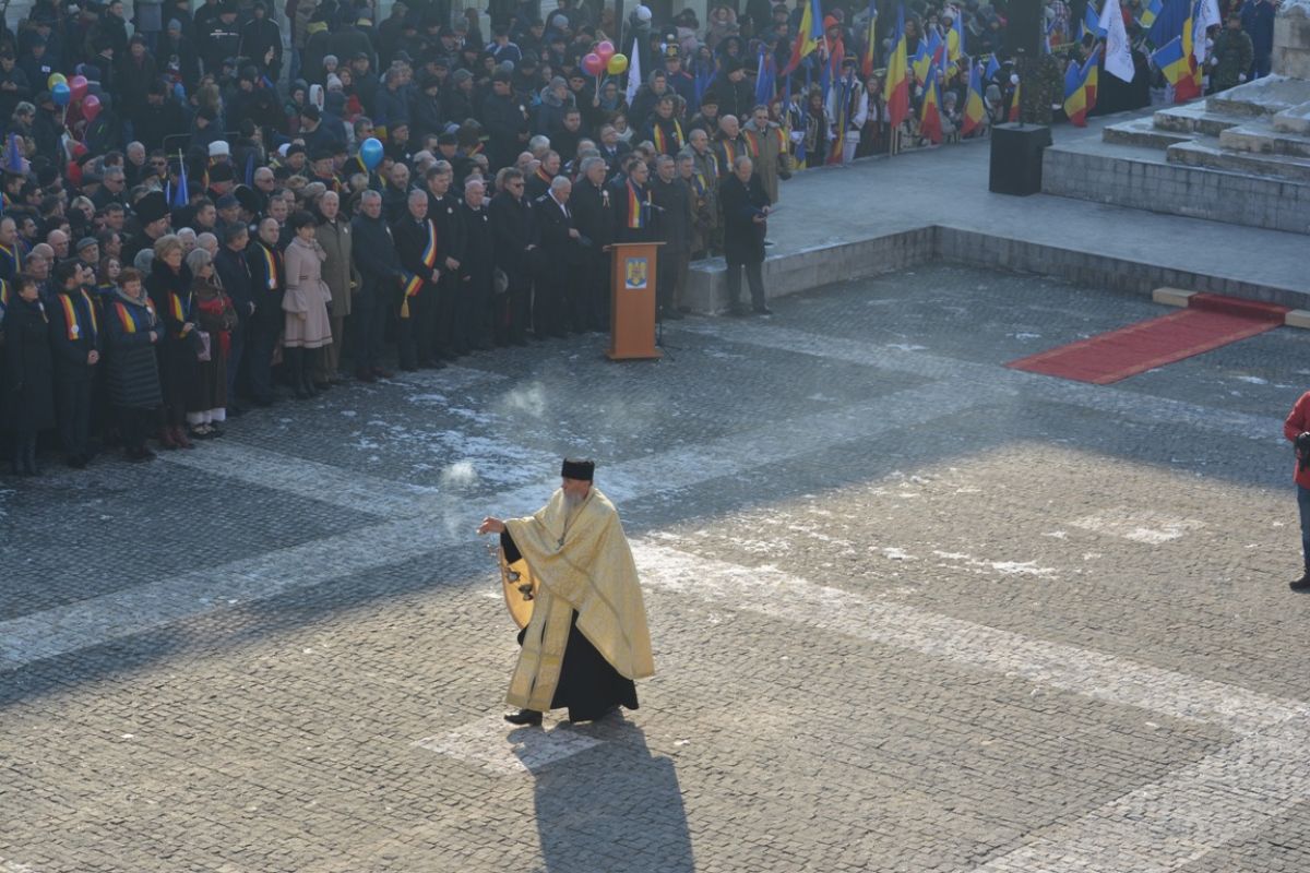 Prefectul Dan Şlincu a primit onorul de la Garda Militară, după care o mulţime de oameni s-a revărsat spre Piaţa 1 Decembrie 1918 agitând sute de drapele naţionale.
