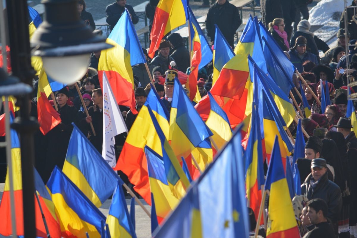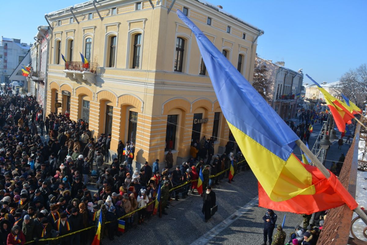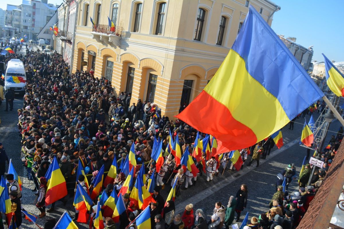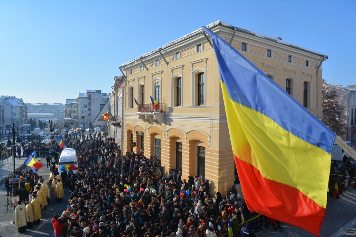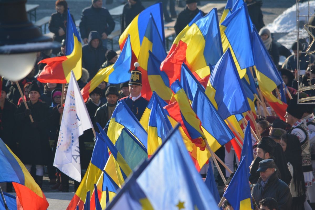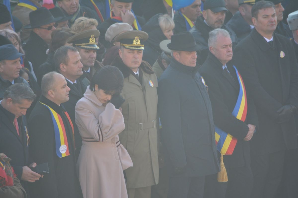 Prefectul Dan Şlincu a primit onorul de la Garda Militară, după care o mulţime de oameni s-a revărsat spre Piaţa 1 Decembrie 1918 agitând sute de drapele naţionale.