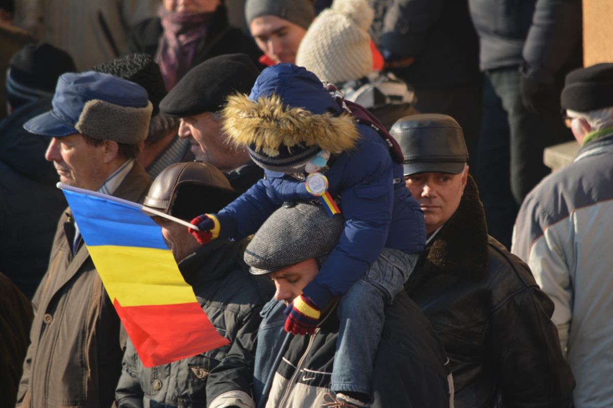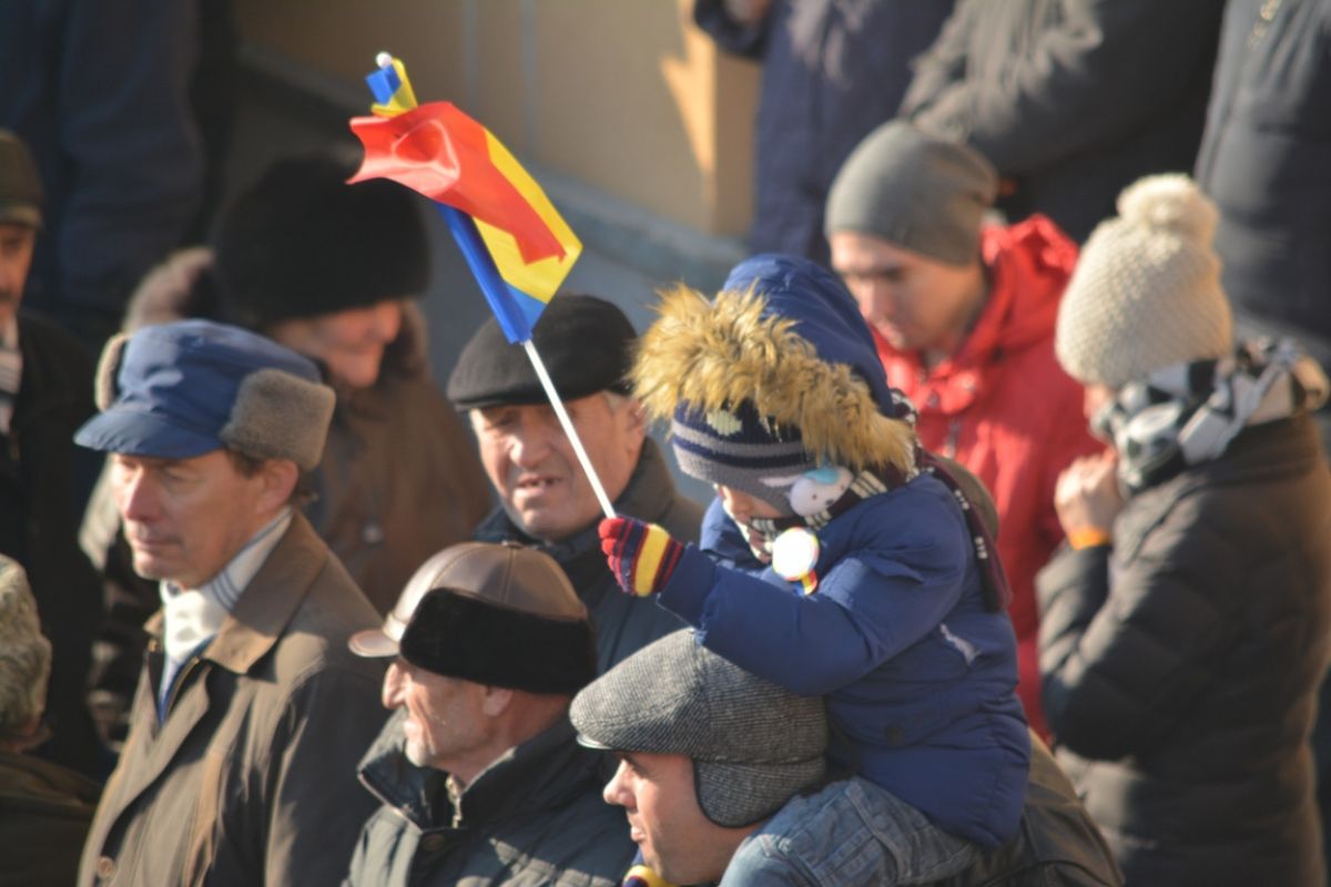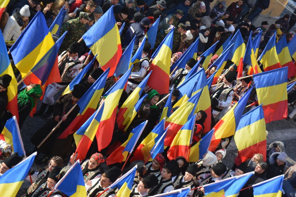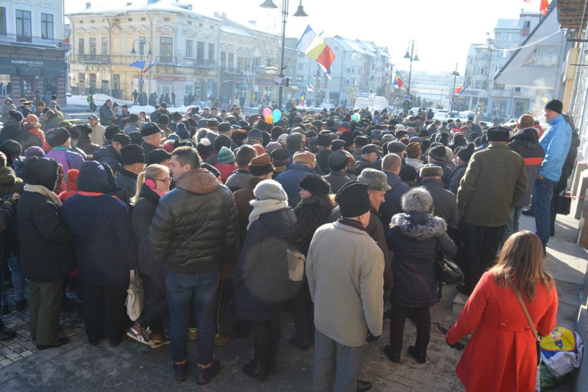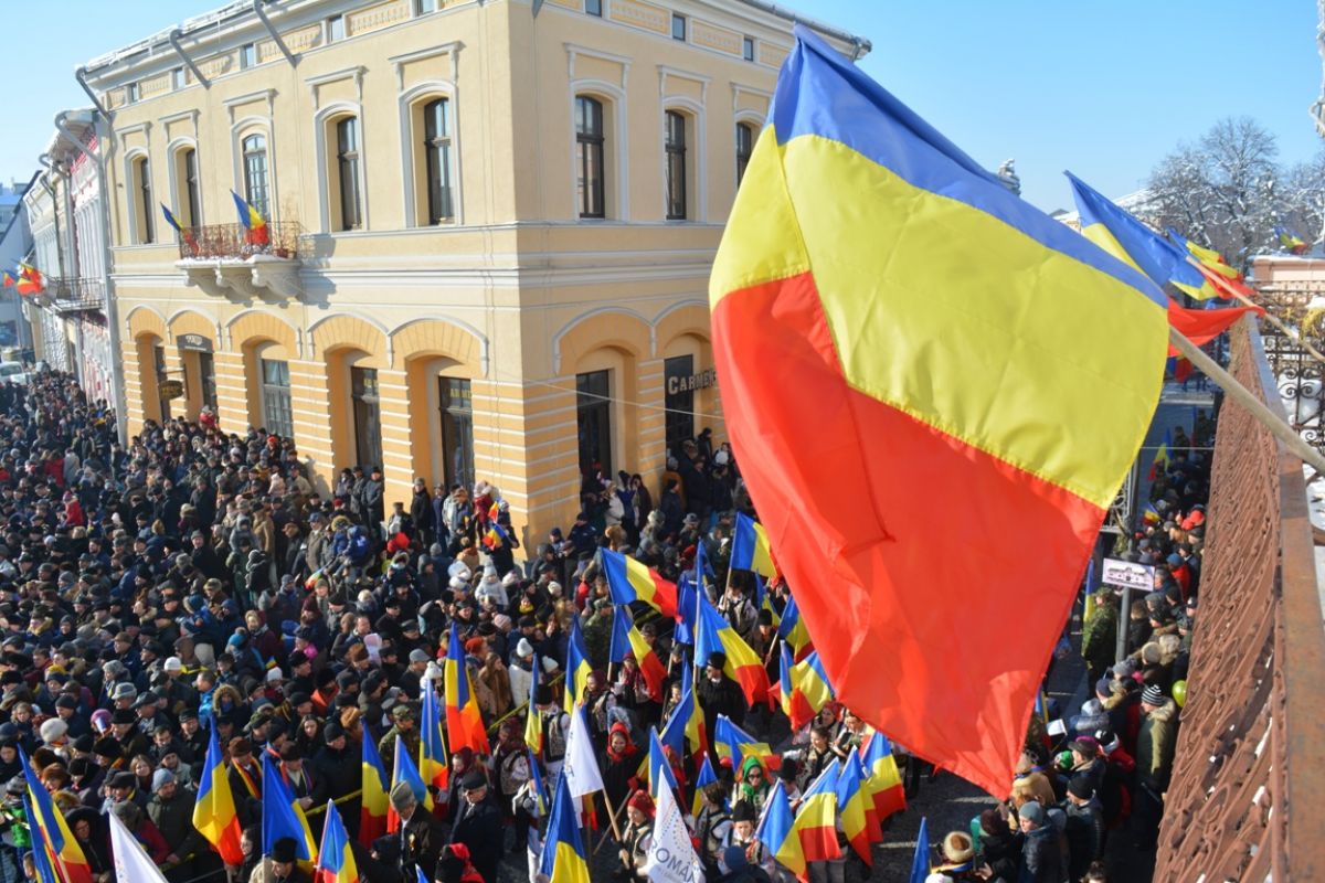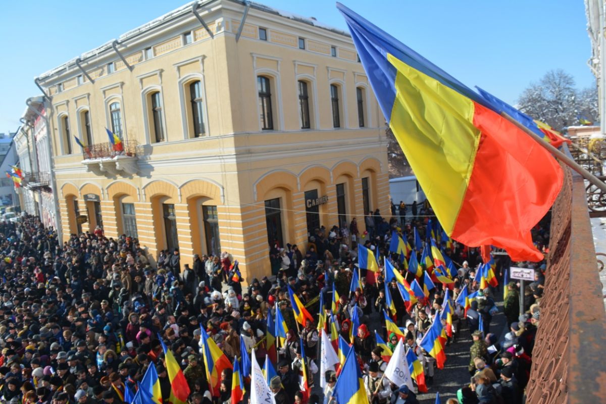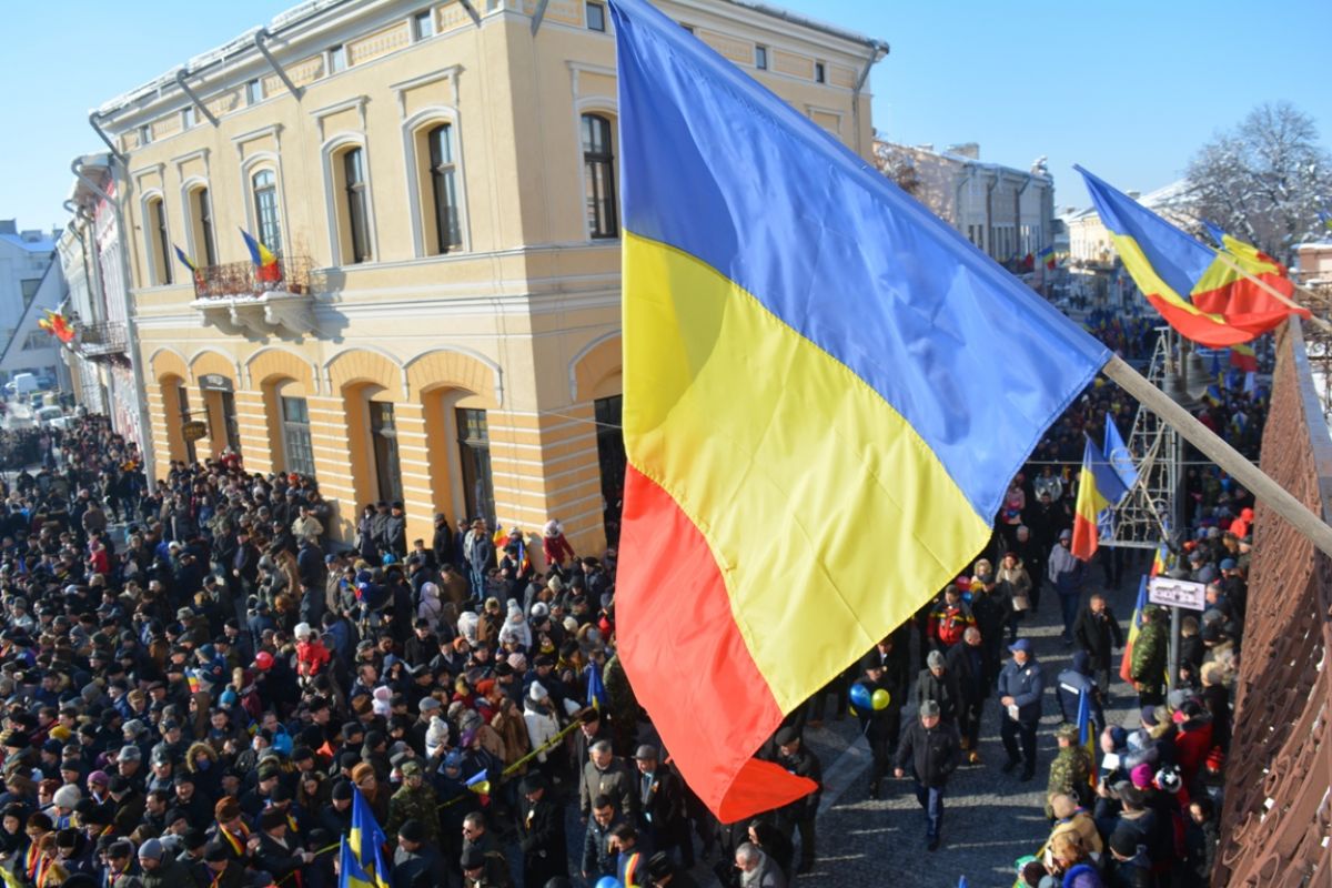 Prefectul Dan Şlincu a primit onorul de la Garda Militară, după care o mulţime de oameni s-a revărsat spre Piaţa 1 Decembrie 1918 agitând sute de drapele naţionale.