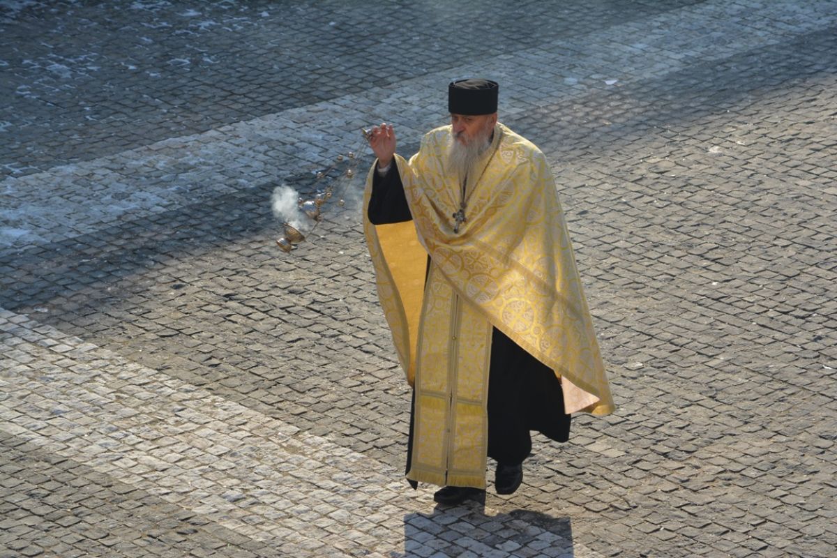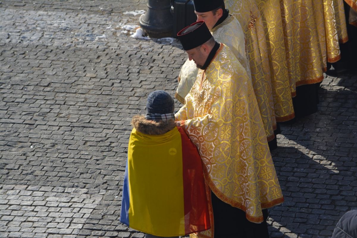 La ora 10:00 oficialităţile au trecut printr-un cupolă tricoloră formată de tineri îmbrăcaţi în costume populare care s-au aşezat pe două rânduri în faţa Bisericii Uspenia.