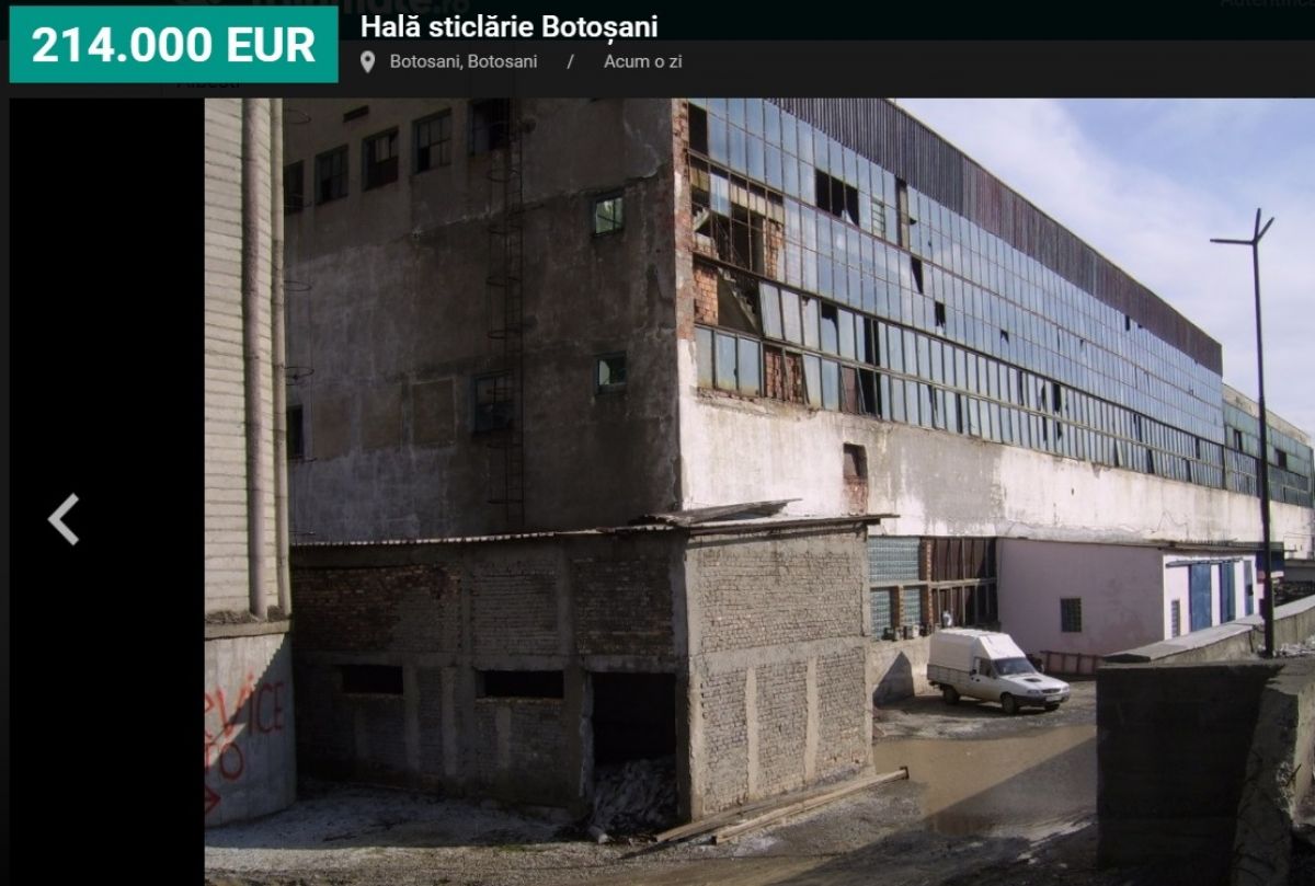 Licitația este organizată pentru vanzarea imobilului „Hală sticlărie si atelier auto”, din strada Cornisa 10,Botosani, la pretul de 962.828 lei fără TVA.