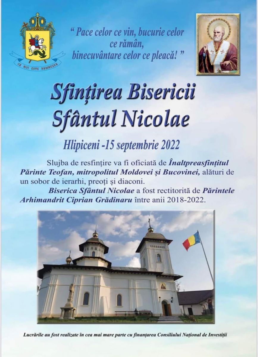 Credincioșii sunt invitați pe 15 septembrie la sfințirea Bisericii ”Sfântul Nicolae” din localitatea Hlipiceni, județul Botoșani.