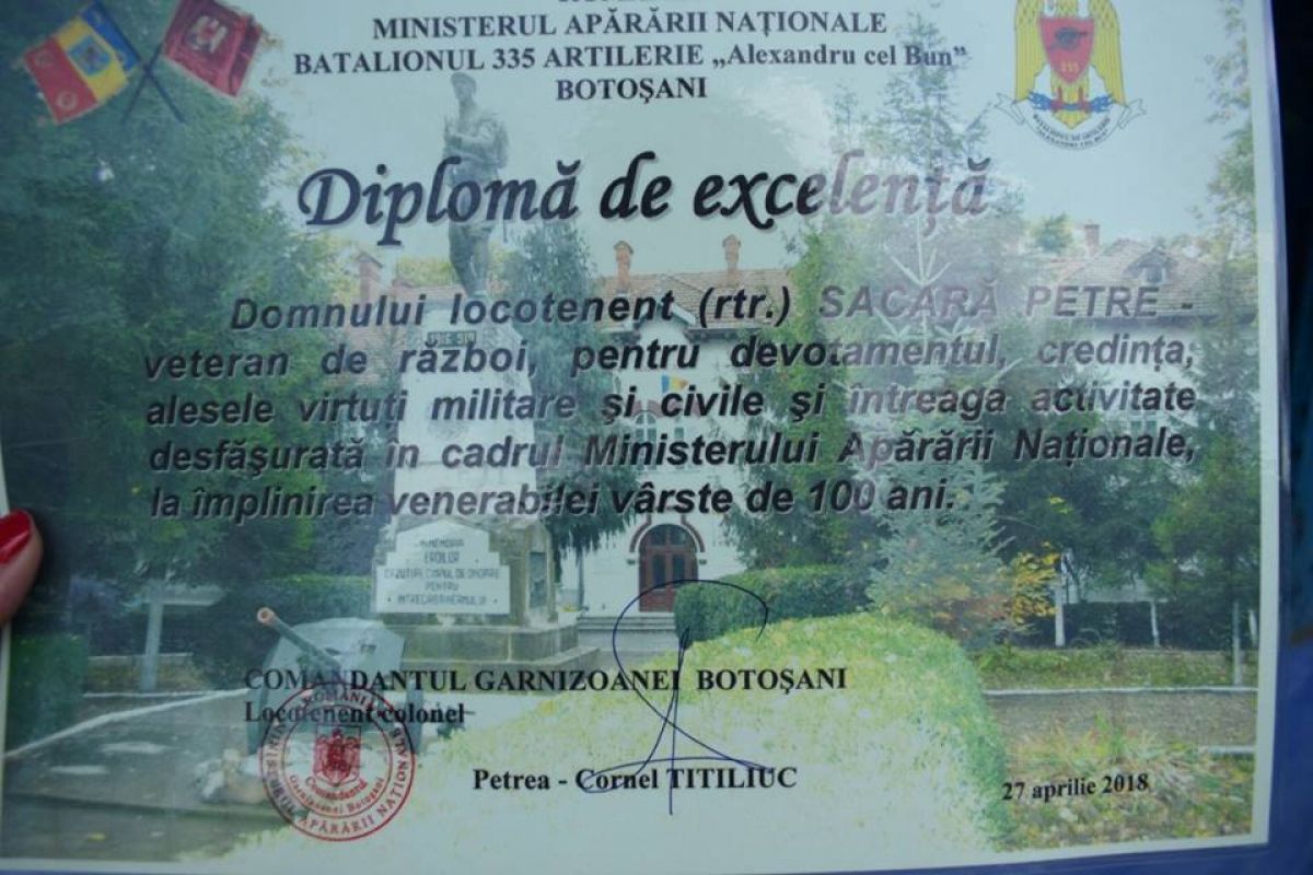A fost felicitat şi domnul Sacară Petre, din satul Băbiceni, comuna Durneşti care în luna august va marca împlinirea celor 100 de ani de viaţă. Îşi aminteşte şi acum perioada în care a fost luat prizonier în Slovacia, în munţii Tatra, în care putea muri în orice clipă. Însă a scăpat cu viaţă şi sfatul cel mai de preţ pe care îl oferă celor tineri este ,,trăieşte fiecare moment ca şi cum ar fi ultimul’’.