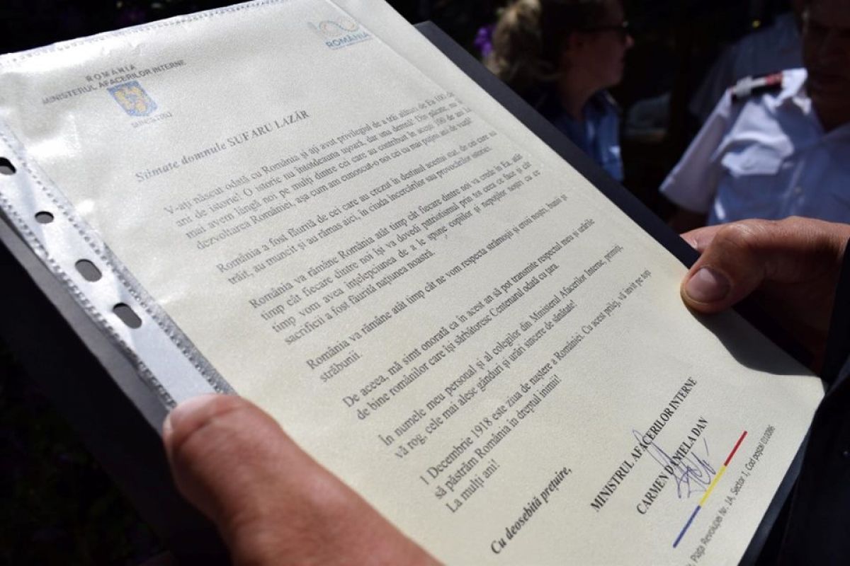 Cei cinci botoşăneni care au ajuns la venerabila vârstă de 100 de ani au primit o scrisoare de felicitare semnată de ministrul Afacerilor Interne, Carmen Daniela Dan, precum şi un tricolor şi o insignă cu inscripţia ,,România 100’’.
