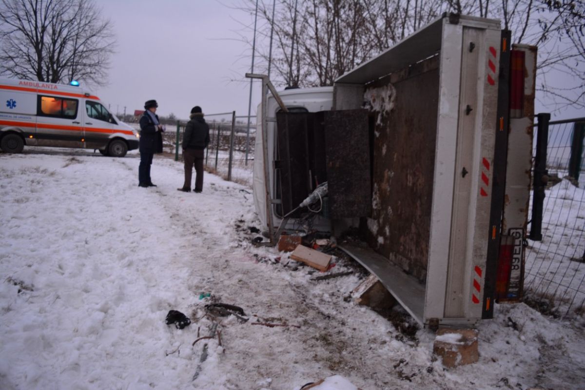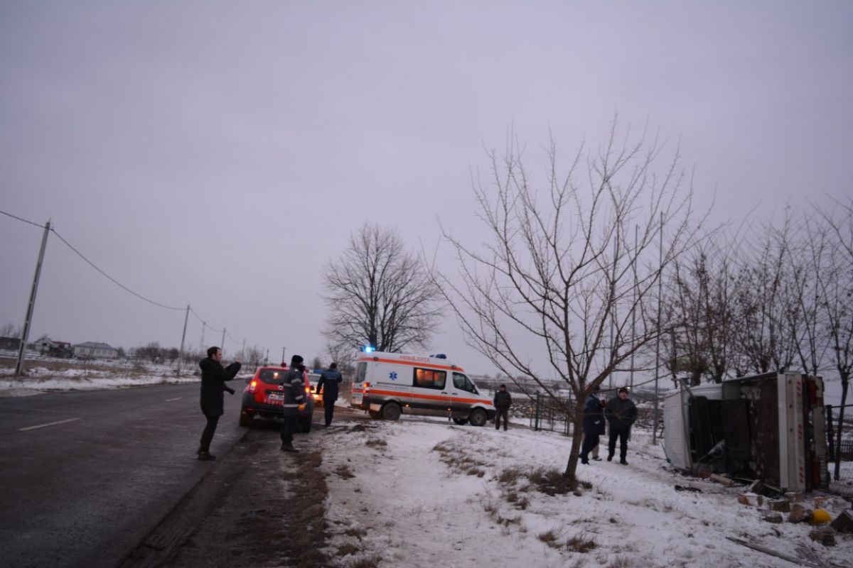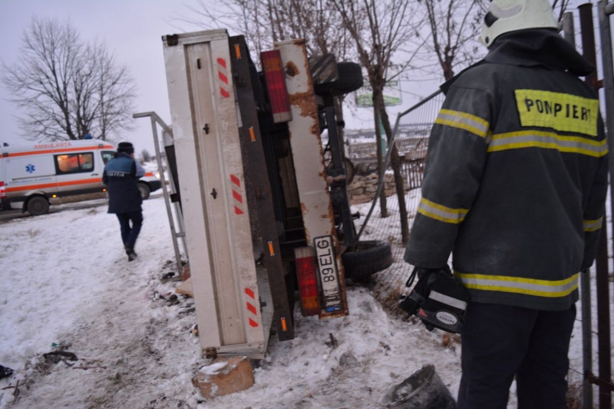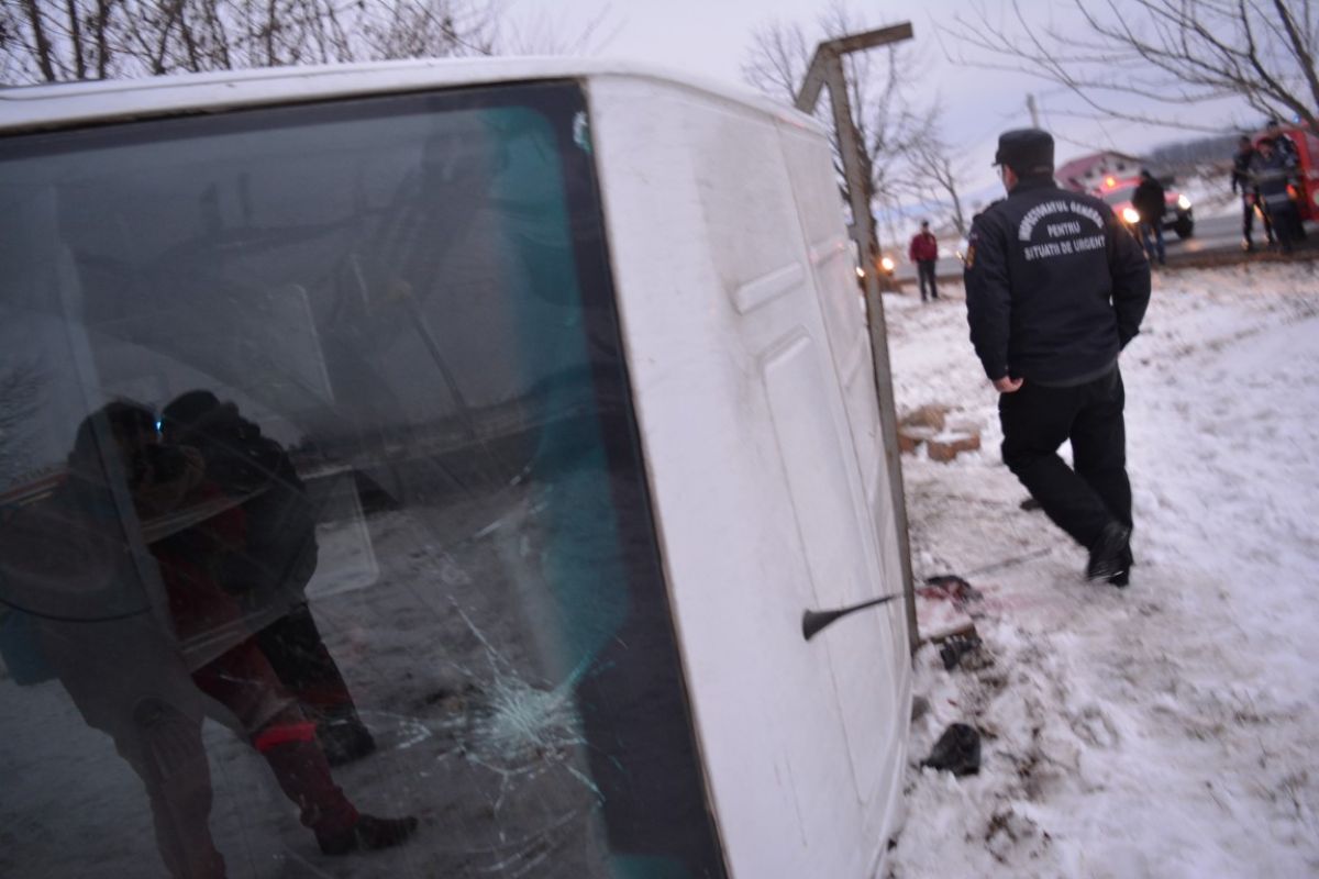 O autoutilitară Mercedes a unei firme de construcţii din Botoşani s-a răsturnat sâmbătă după-amiază la ieşirea din Zăiceşti.