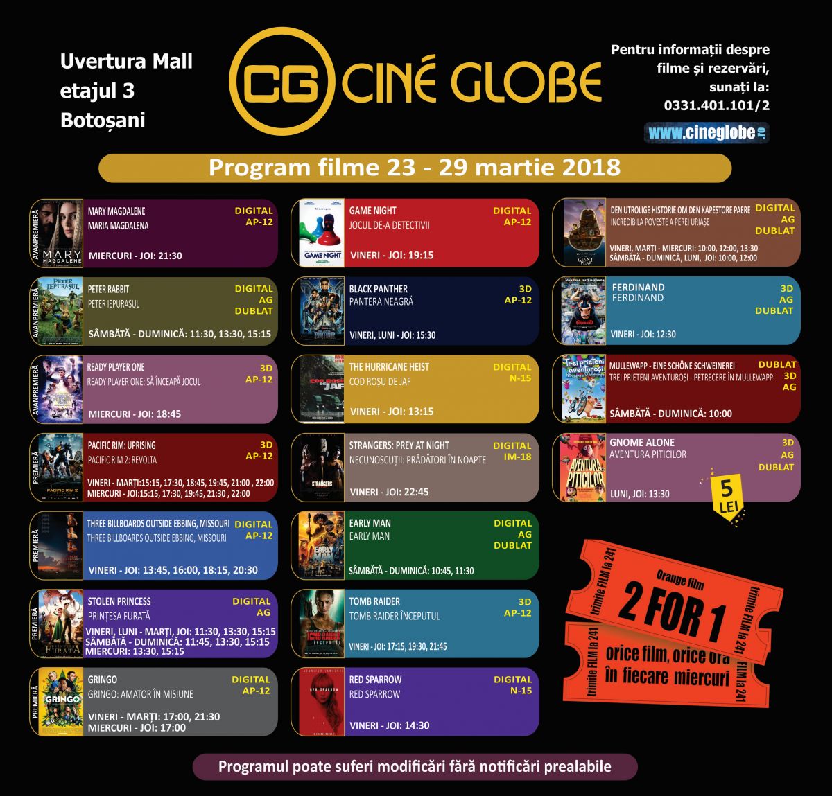 În perioada 23– 29 martie 2018 multiplexul din Uvertura Mall Cine Globe invită botoșănenii să urmărească în avanpremieră cele mai noi filme, menite să ne pregătească de venirea Paştelui şi nu numai.