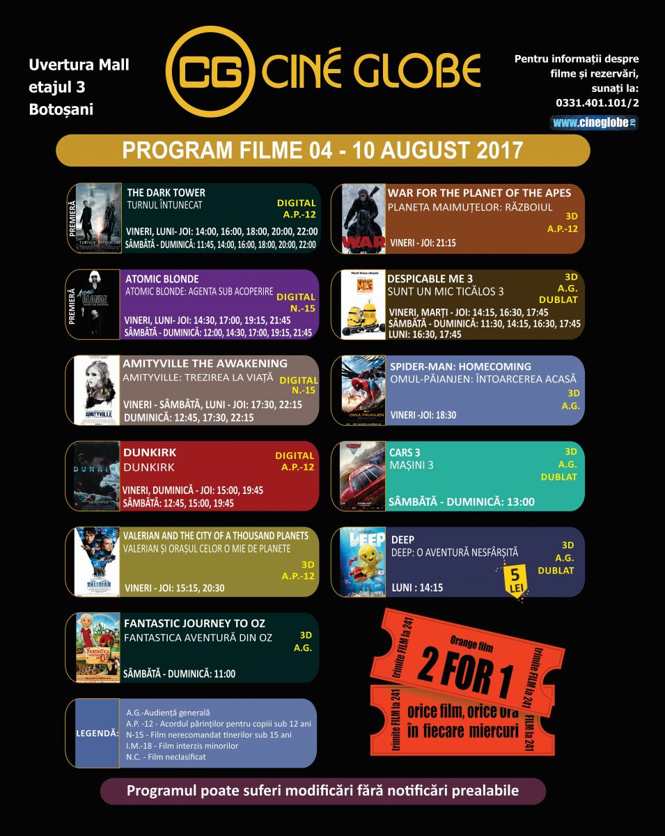 Reprezentanții singurului multiplex de la Botoșani, aflat în incinta Uvertura Mall au transmis programul de difuzare pentru săptămâna 4 – 10 august.