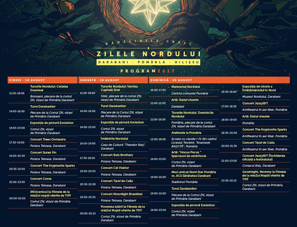 Programul complet pe zile și pe ore este disponibil online pe site-ul https://www.zilelenordului.ro/program/