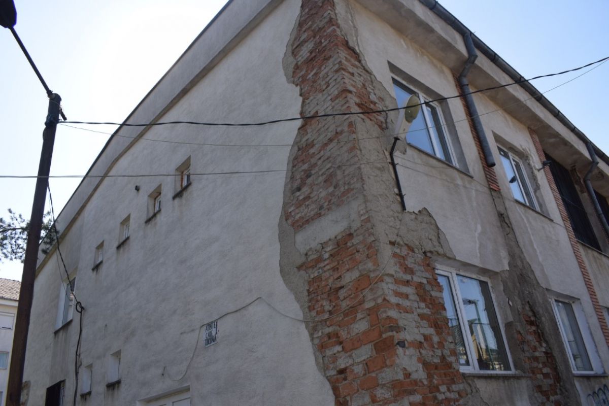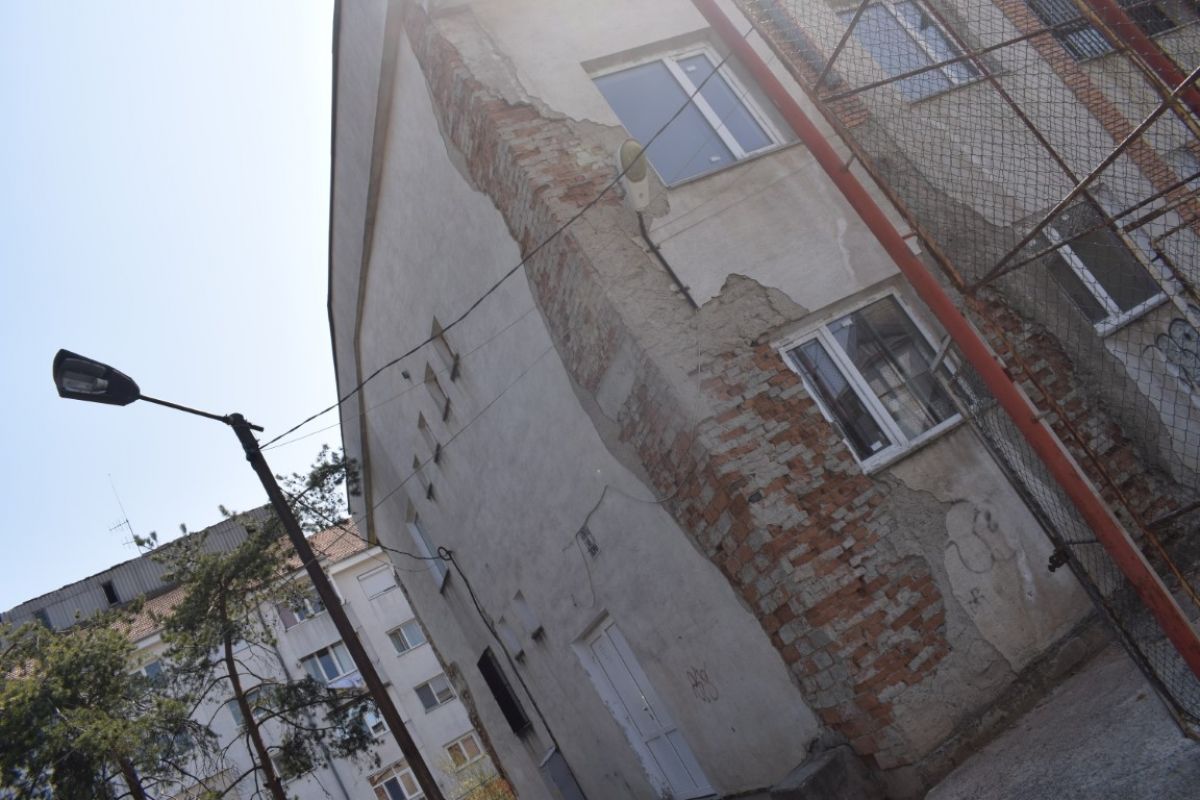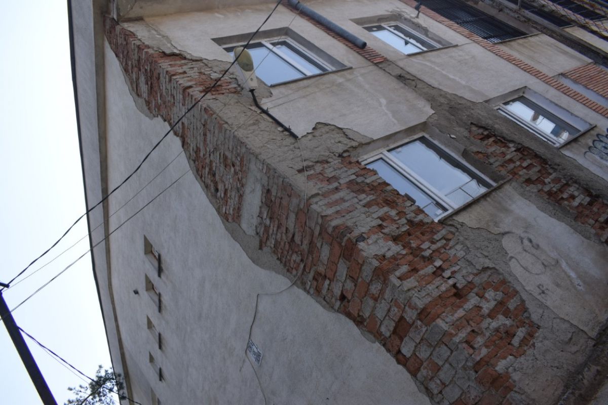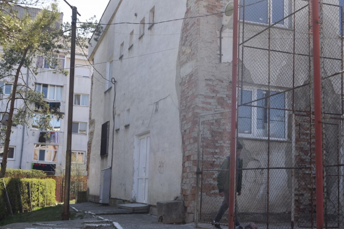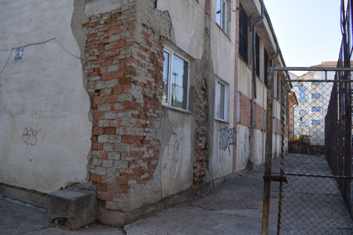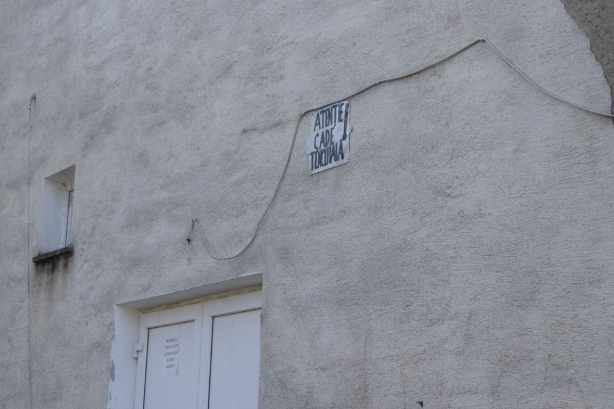 Bucăți întregi de tencuială s-au desprins deja, altele încă se agață încăpățânat de clădirea mamă. Părțile de cărămizi dezvelite de vreme contrastează cu petele închise la culoare cauzate de infiltrațiile care năruiesc imobilul.