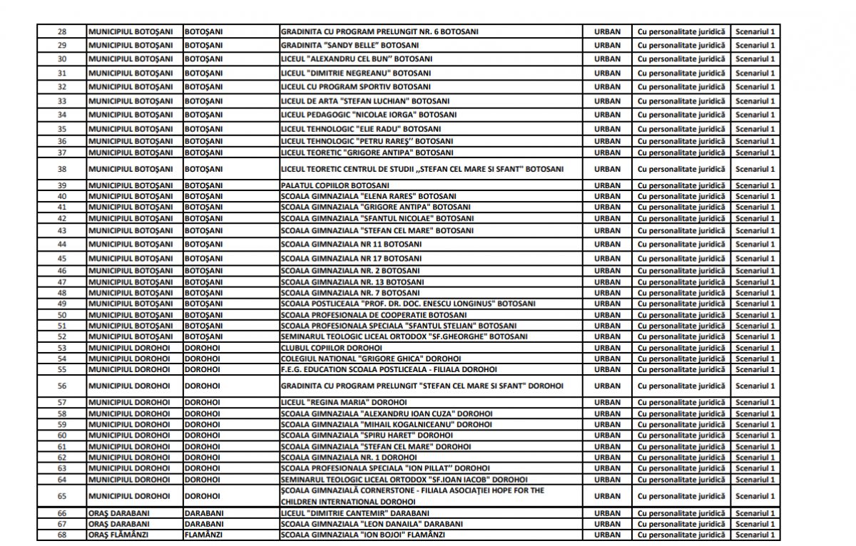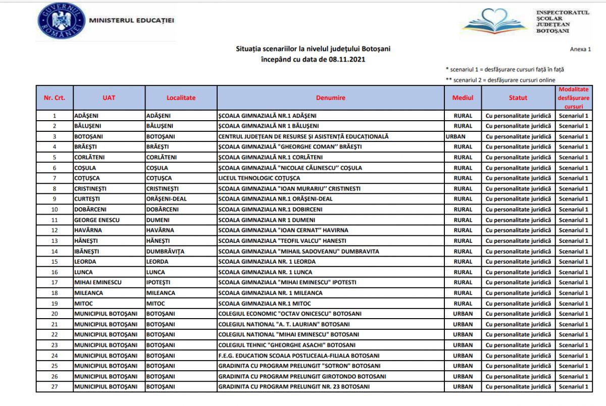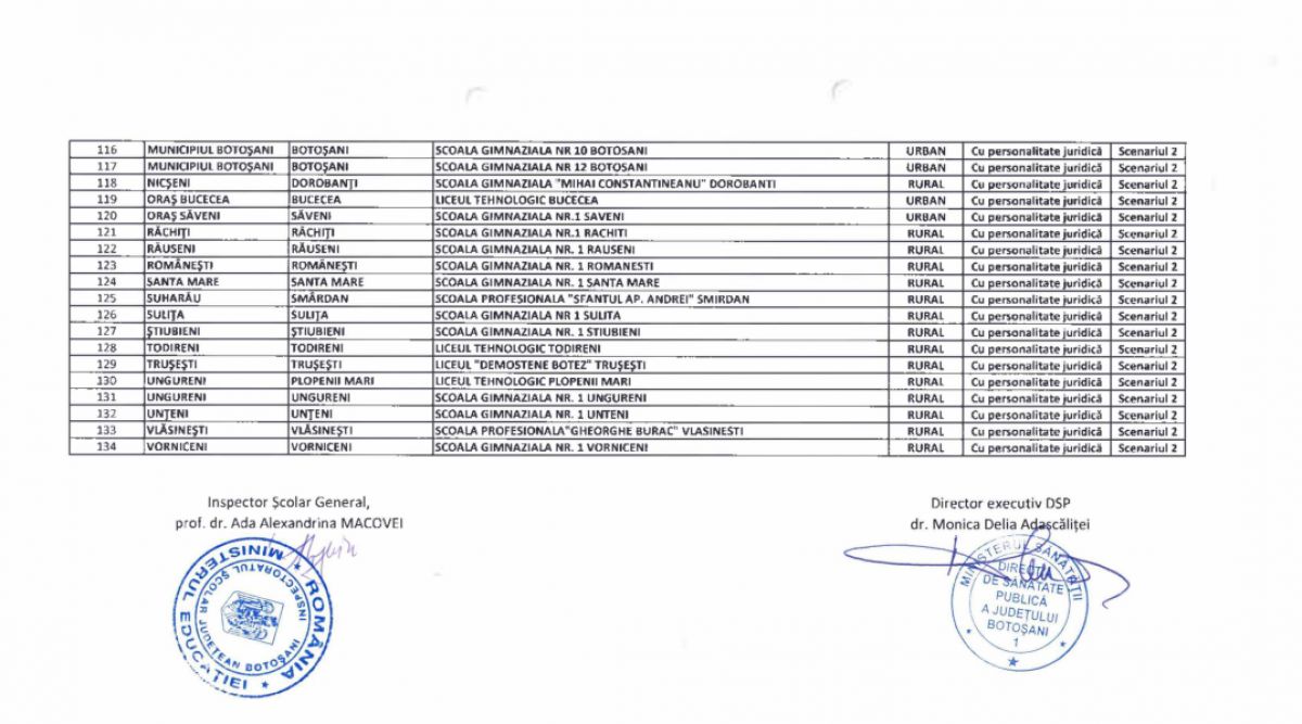 Trecerea de la scenariul online la scenariul cu prezenta fizica se face prin decizia consiliilor de administrație ale unităților de învățământ preuniversitar, cu informarea Inspectoratului Școlar Județean Botoșani, în situația atingerii procentului de 60% din personalul vaccinat”,