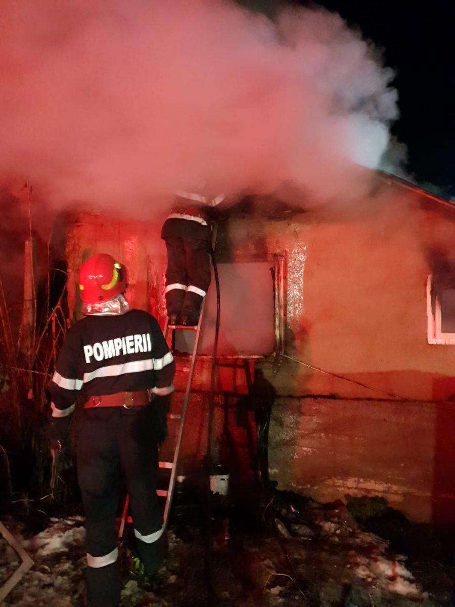 Incendiul se manifesta violent la acoperișul unei clădiri administrative, în care a funcționat poșta din localitate.