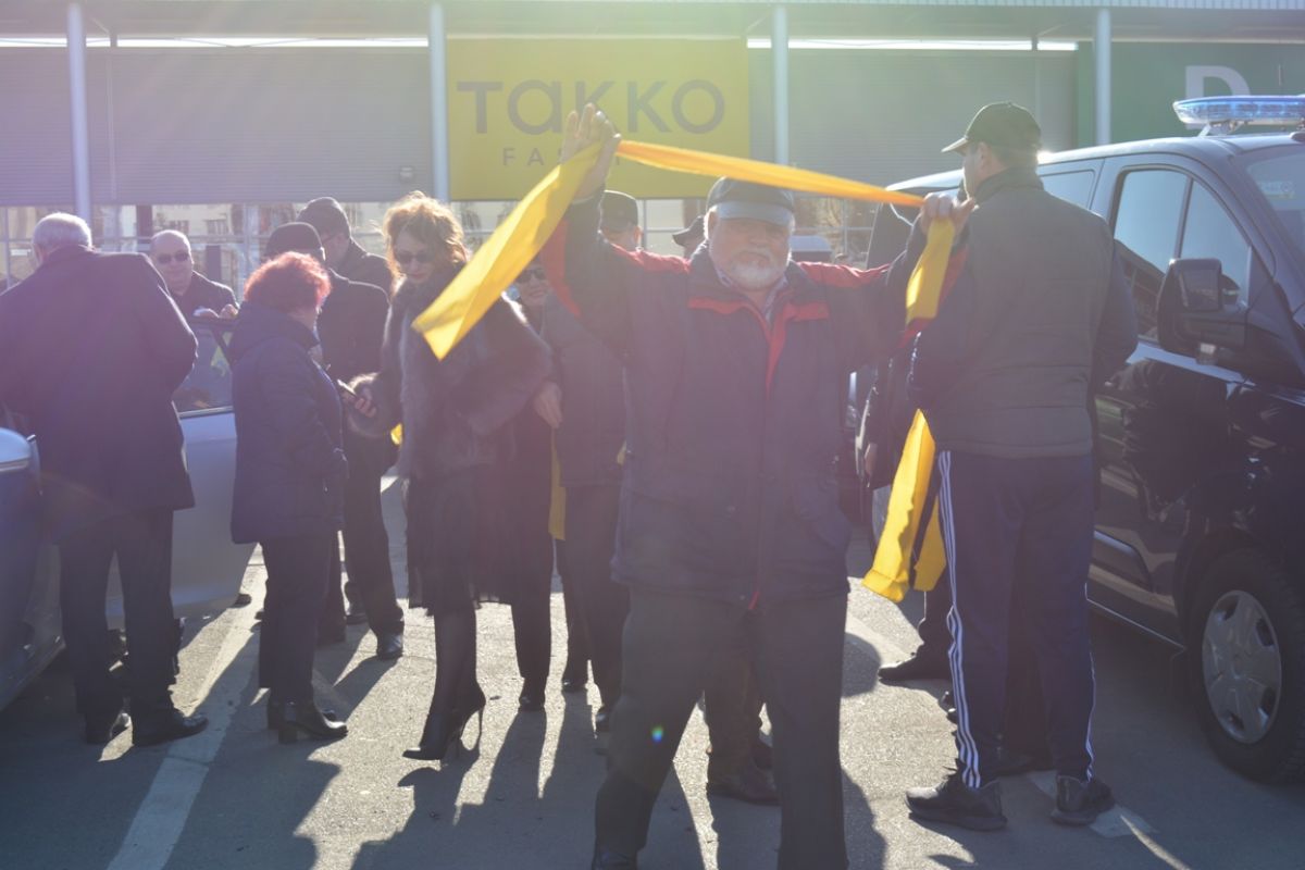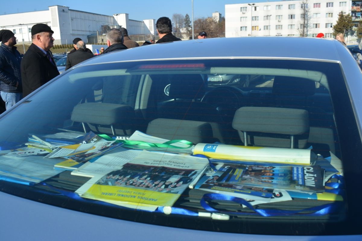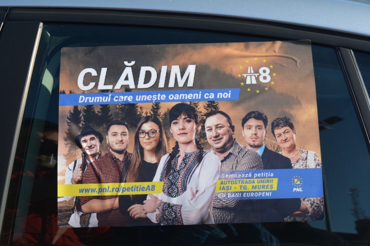 Membrii PNL au venit la acțiune cu eșarfe galbene și cu steaguri tricolore, iar pe automobile și-au lipit afișe cu mesajul: ”Clădim A8 - Drumul care unește oameni ca noi”.