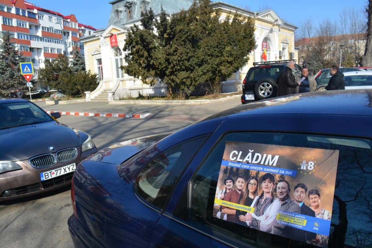 Început în jur de ora 10:00 în parcarea de la Kaufland, marșul pe patru roți organizat de PNL Botoșani pentru Autostrada Iași - Târgu-Mureș a străbătut mai multe artere din oraș și s-a oprit pe strada Independenței.