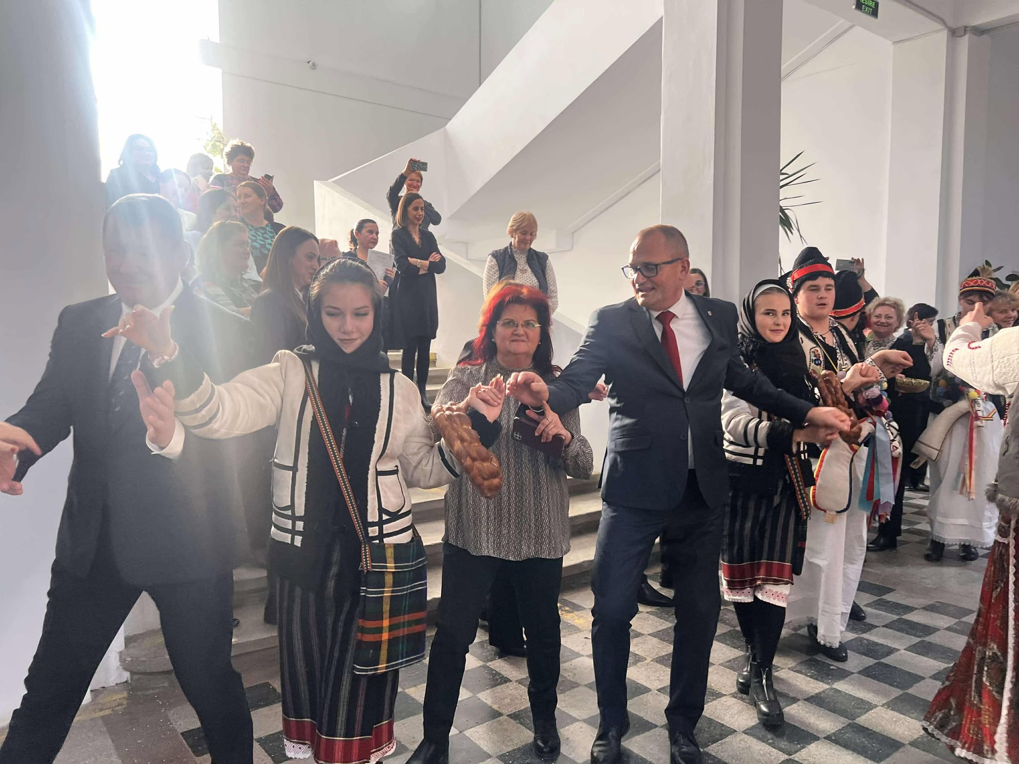 Cei doi șefi s-au prins în horă cu tinerii artiști la finalul spectacolului de datini și obiceiuri.