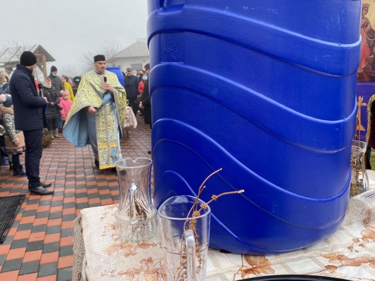 În fața bisericii au fost aduse trei butoaie pline cu apă, pe care părintele a sfințit-o.