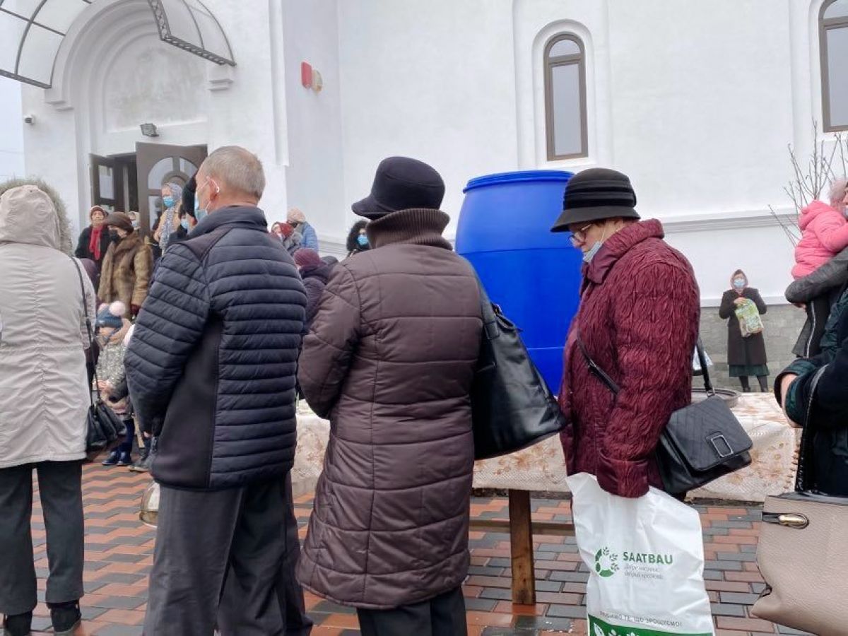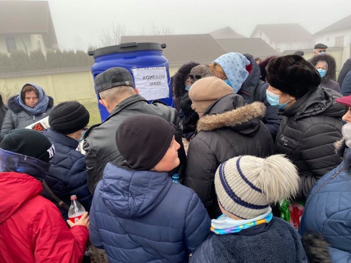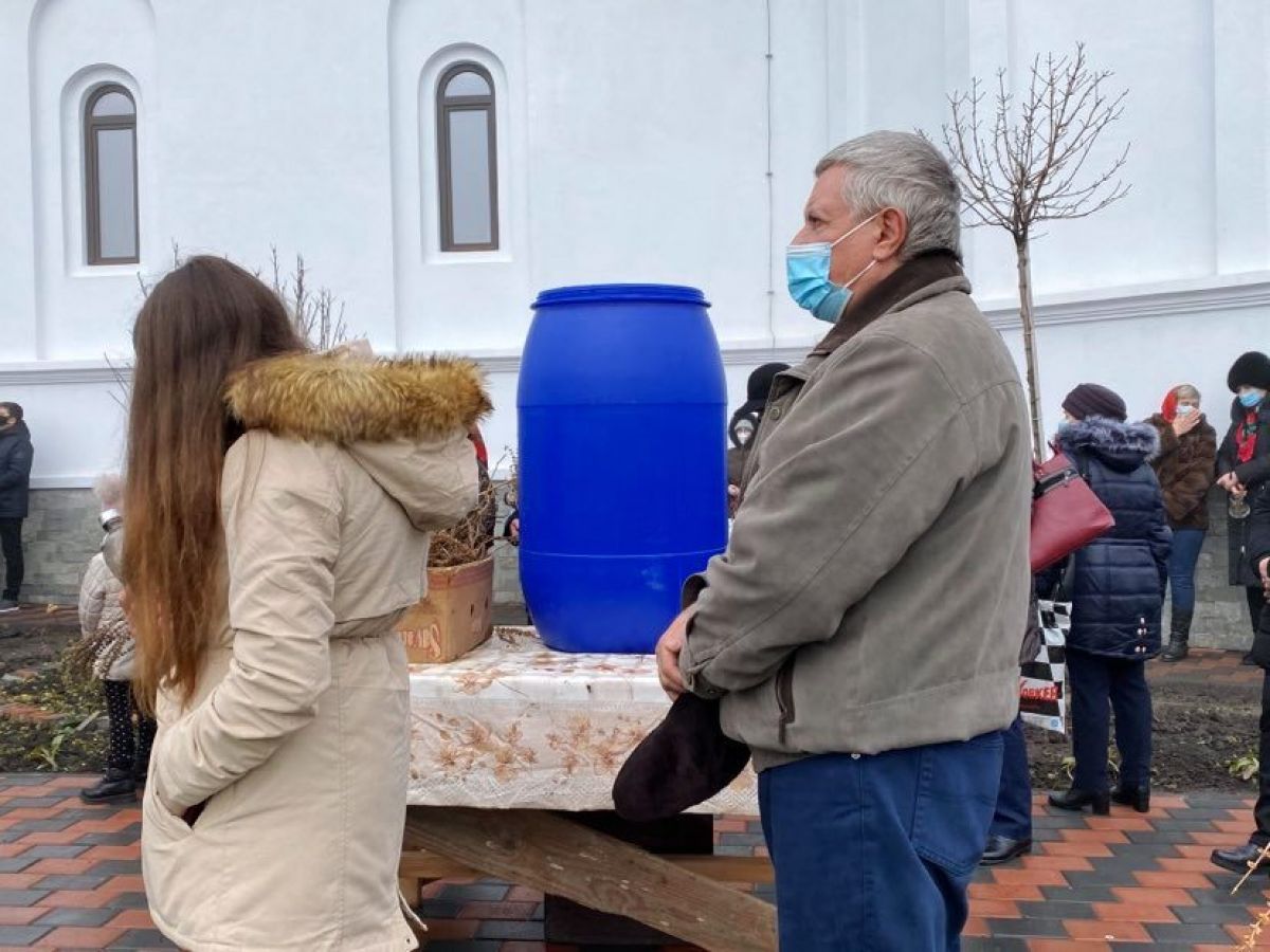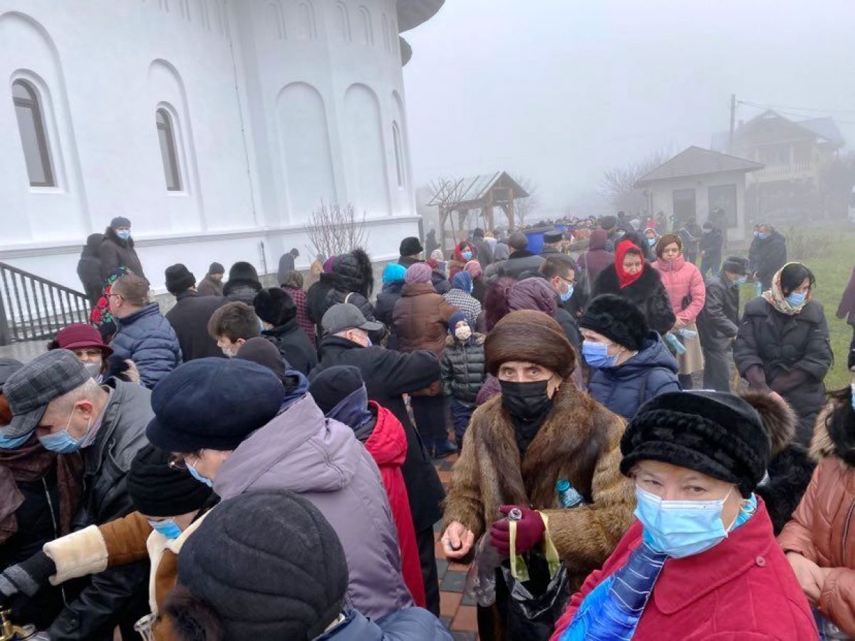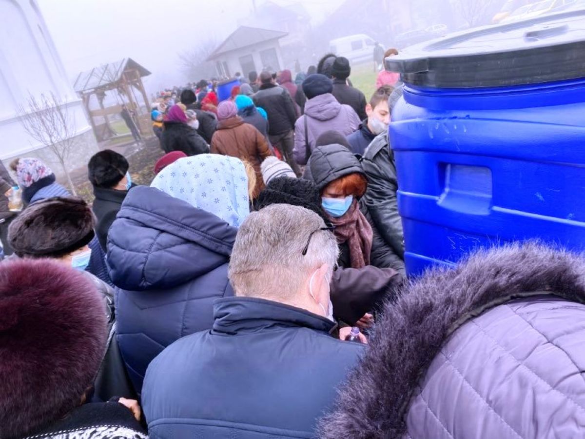 În jurul orei 11:30 părintele a intrat în biserică și oamenii, aproape toți purtând măști, s-au îngrămădit la butoaiele cu apă.