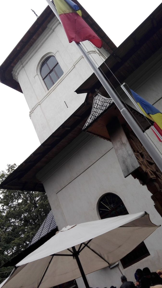 Credincioşii au stat la rând pentru a atinge veşminte sfinte aşezate spre venerare în curtea lăcaşului de cult.