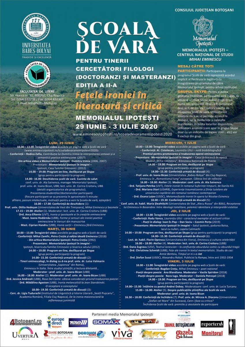 Memorialul Ipotești – Centrul Național de Studii „Mihai Eminescu”, în parteneriat cu Universitatea „Babeș-Bolyai” din Cluj-Napoca (Facultatea de Litere, Departamentul de literatura română și teoria literaturii), organizează, on-line, în perioada 29 iunie-3 iulie 2020, Școala de vară pentru tinerii cercetători filologi (masteranzi și doctoranzi) „Fețele ironiei în literatură și critică”.