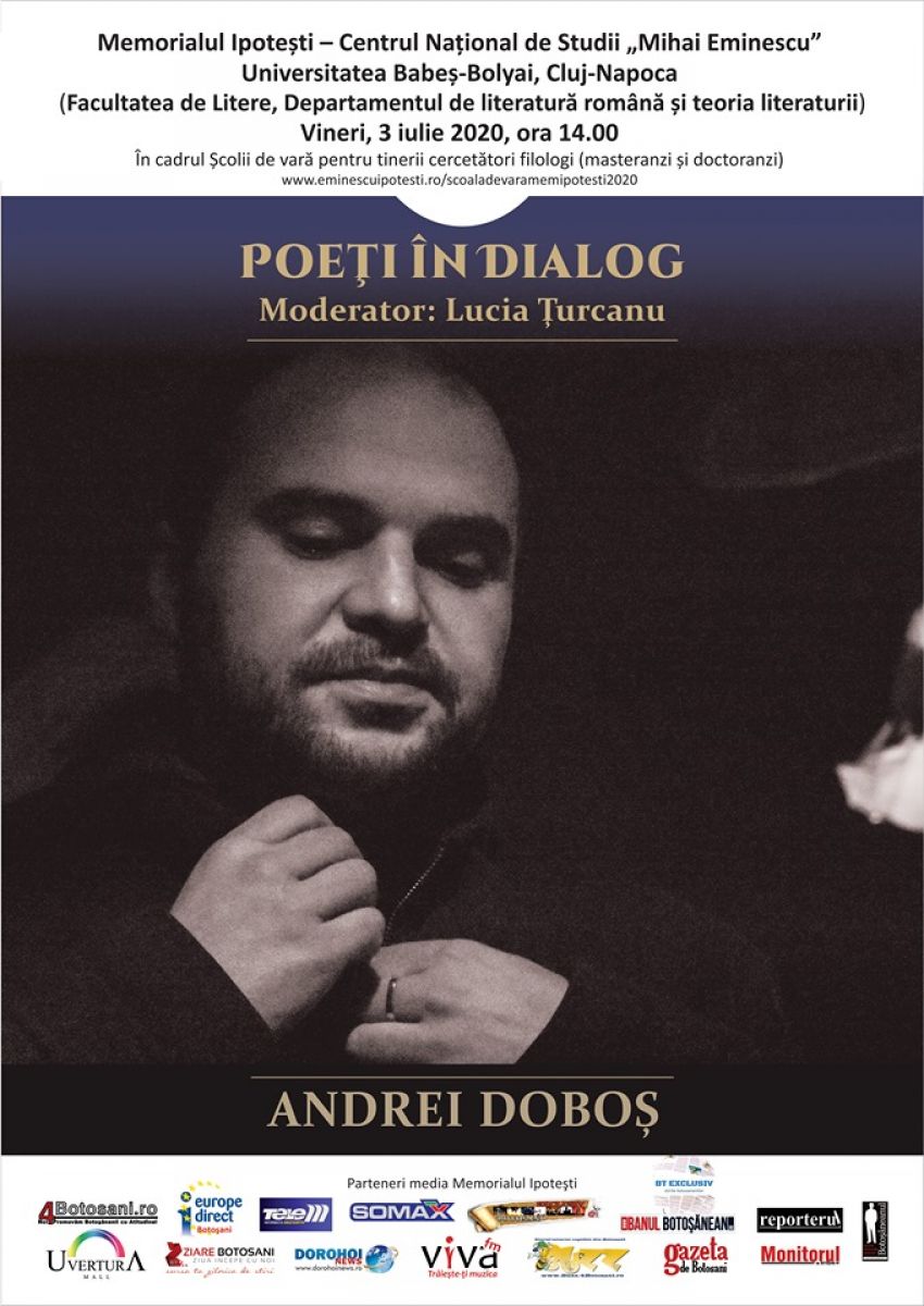 În cadrul Școlii de vară pentru tinerii cercetători filologi (masteranzi și doctoranzi) „Fețele ironiei în literatură și critică”, se va organiza (pe 3 iulie, la ora 14.00) ediția din iulie a întâlnirilor „Poeți în dialog”, la care este invitat poetul Andrei Doboș. Dialogul va fi moderat de Lucia Țurcanu.