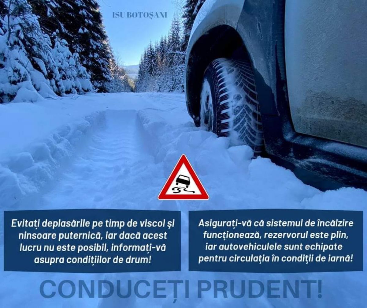 Inspectoratul pentru Situații de Urgență vă recomandă ca, dacă sunteți nevoiți să porniți la drum, să vă informați despre condițiile de trafic. Puneți în mașină lucruri necesare în caz de urgență: lanțuri antiderapante, lopată pentru zăpadă, lanternă, un sac cu nisip, apă, pături, încărcător pentru telefon.