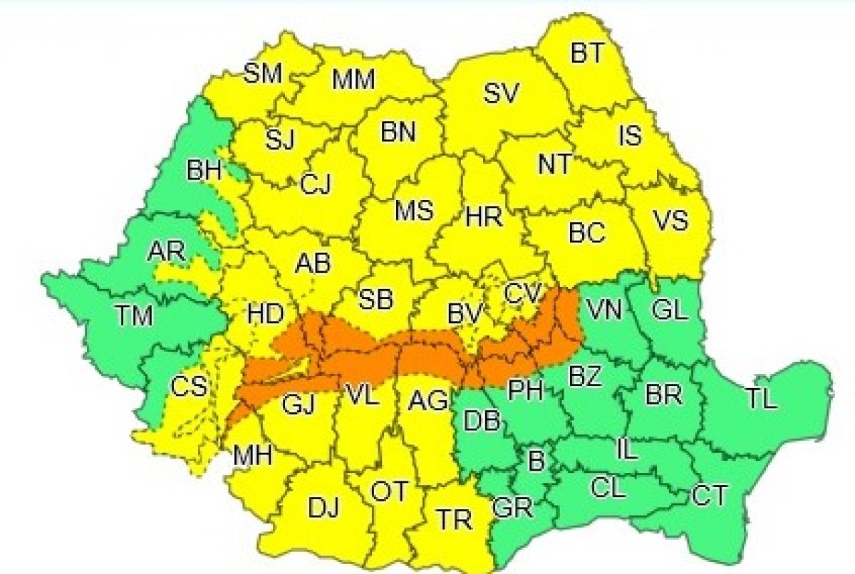 Administrația Națională de Meteorologie a emis mai multe avertizări pentru zilele de miercuri și joi, fiind vizate aproape toate județele țării.