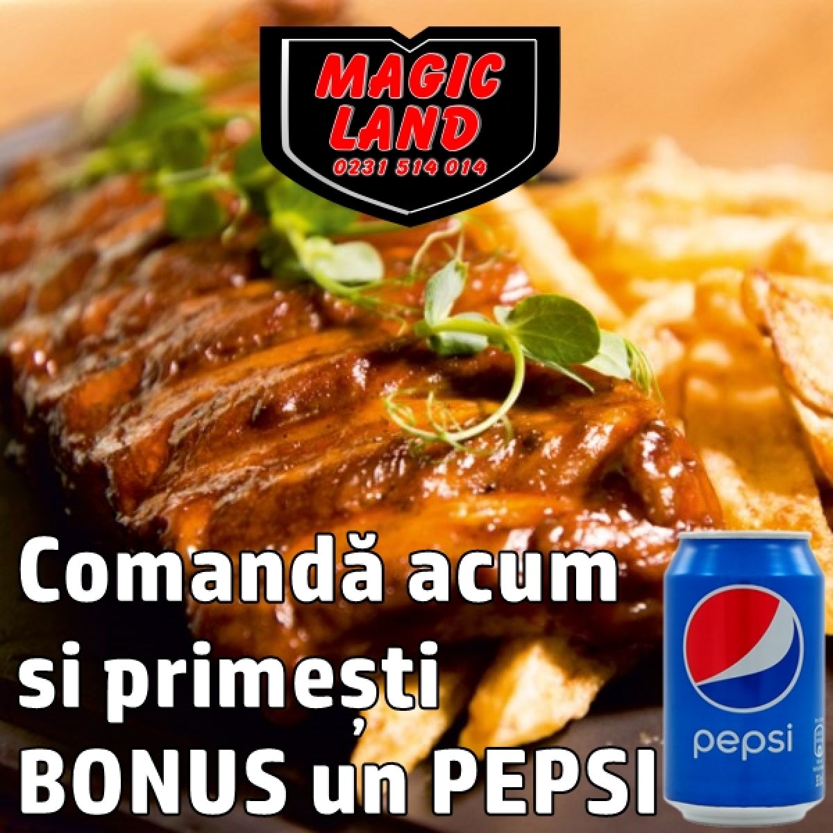 (P) Restaurantul Magic Land anunță că începând de luni 22.03.2021 clienții vor primi bonus o doză de Pepsi, la fiecare comandă.