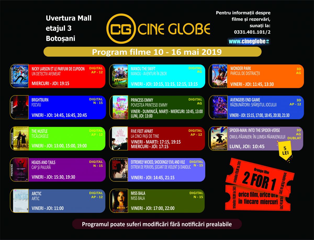 Reprezentanții singurului multiplex de la Botoșani, aflat în incinta Uvertura Mall au transmis programul de difuzare pentru săptămâna 10-16 mai 2019.