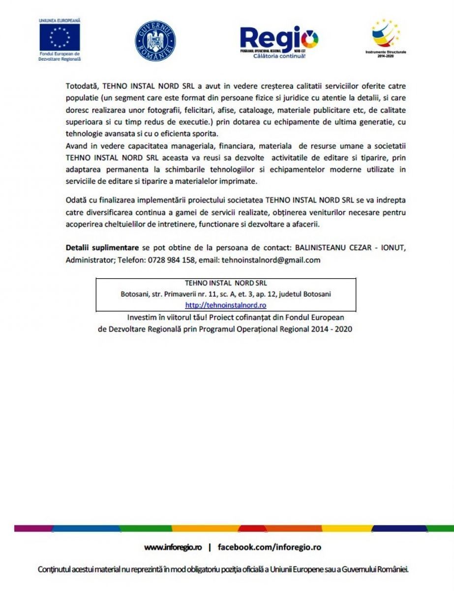 Obiectivele proiectului: cresterea competitivitatii microintreprinderii Tehno Instal Nord SRL, prin achizitionarea de echipamente specifice serviciilor aferente activitatilor de editare si tiparire (Cod Caen 5819 – Alte activitati de editare) si recrutarea, selectia si angajarea a trei persoane (din care una din categorii defavorizate), suplimentar fata de personalul existent in cadrul intreprinderii, utiland astfel societatea cu tehnologie avansata si eficienta necesara realizarii unor servicii de calitate superioara, in conditii de siguranta si respectarea normelor de mediu.