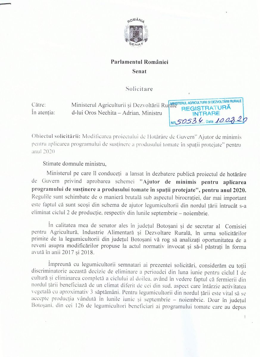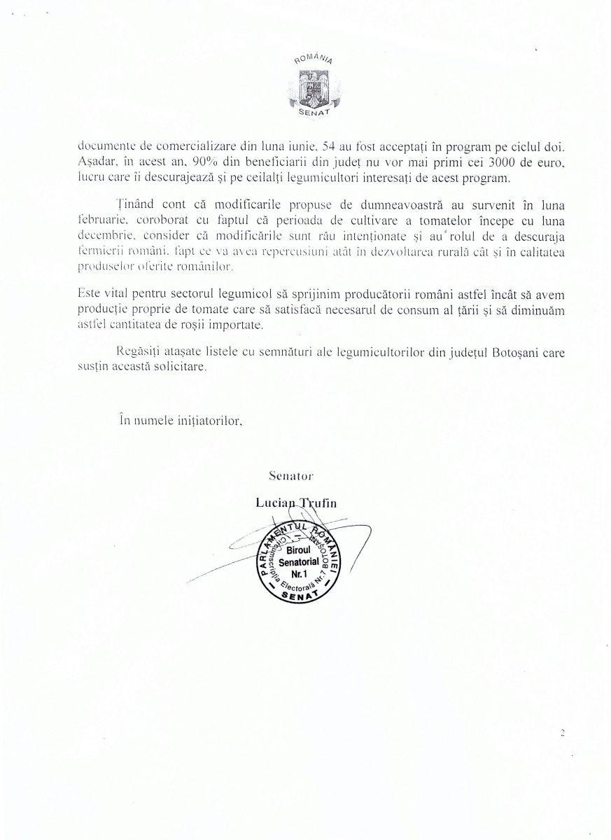 Senatorul Lucian Trufin a înaintat o solicitare semnată de 65 de cultivatori de tomate din 15 localități din județul Botoșani, beneficiari ai programului tomate, adresată ministrului agriculturii, domnul Nechita Oros, prin care a atras atenția asupra faptului că legumicultorii din nordul țării sunt excluși practic din program și nu vor mai primi ajutorul de 3000 de euro.
