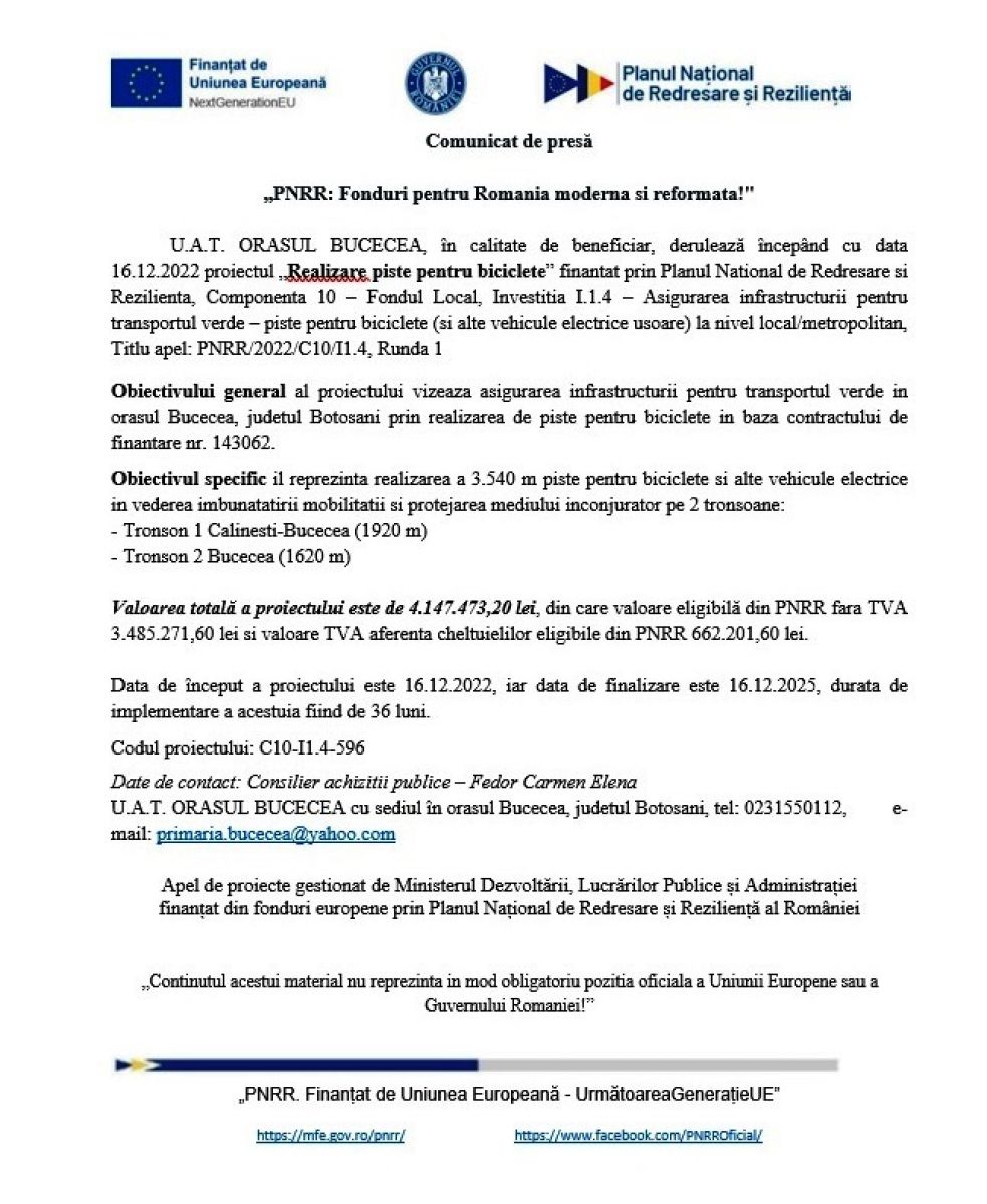 U.A.T. ORASUL BUCECEA, în calitate de beneficiar, derulează începând cu data 16.12.2022 proiectul „Realizare piste pentru biciclete” finantat prin Planul National de Redresare si Rezilienta, Componenta 10 – Fondul Local, Investitia I.1.4 – Asigurarea infrastructurii pentru transportul verde – piste pentru biciclete (si alte vehicule electrice usoare) la nivel local/metropolitan, Titlu apel: PNRR/2022/C10/I1.4, Runda 1
