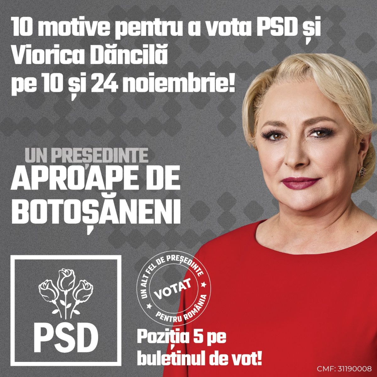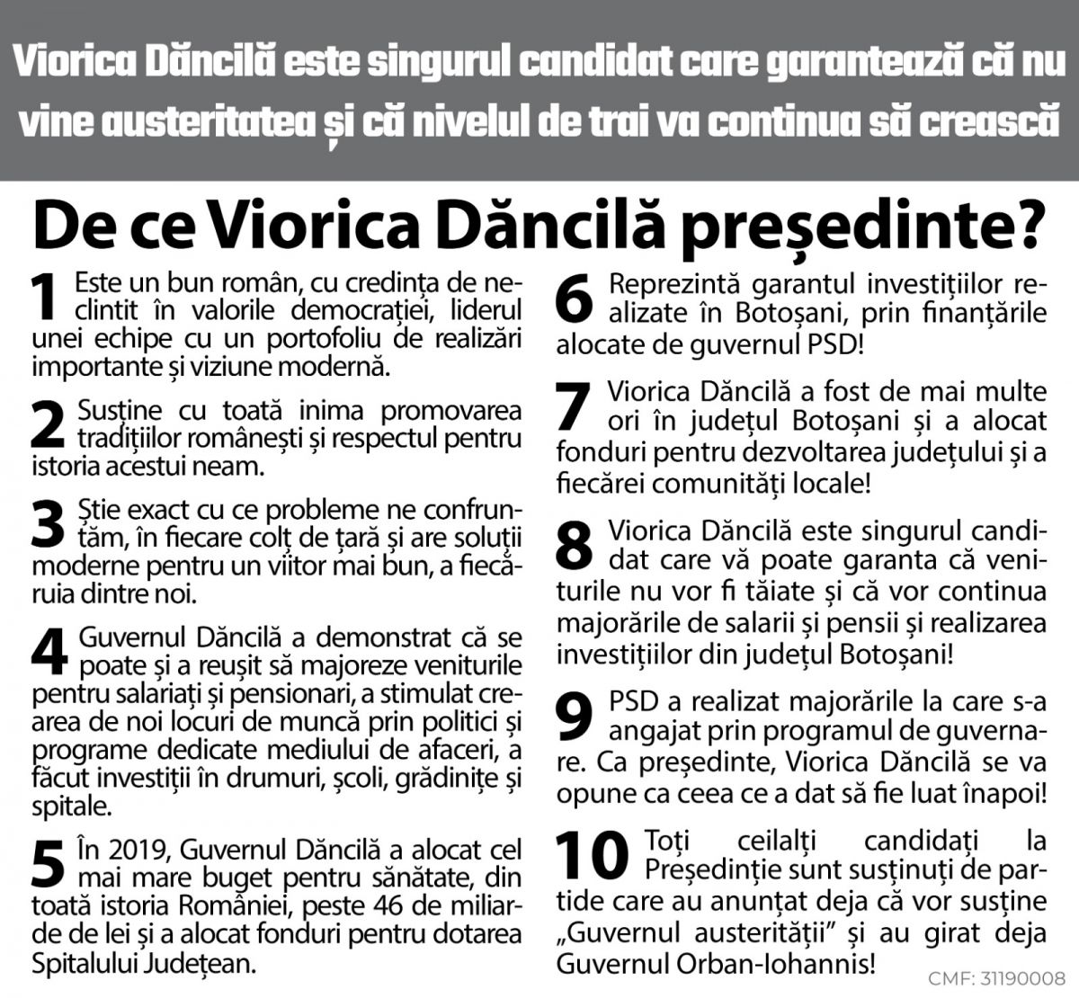 8.Viorica Dăncilă este singurul candidat care poate garanta că veniturile nu vor fi tăiate și că vor continua majorările de salarii și pensii și realizarea investițiilor din județul Botoșani!