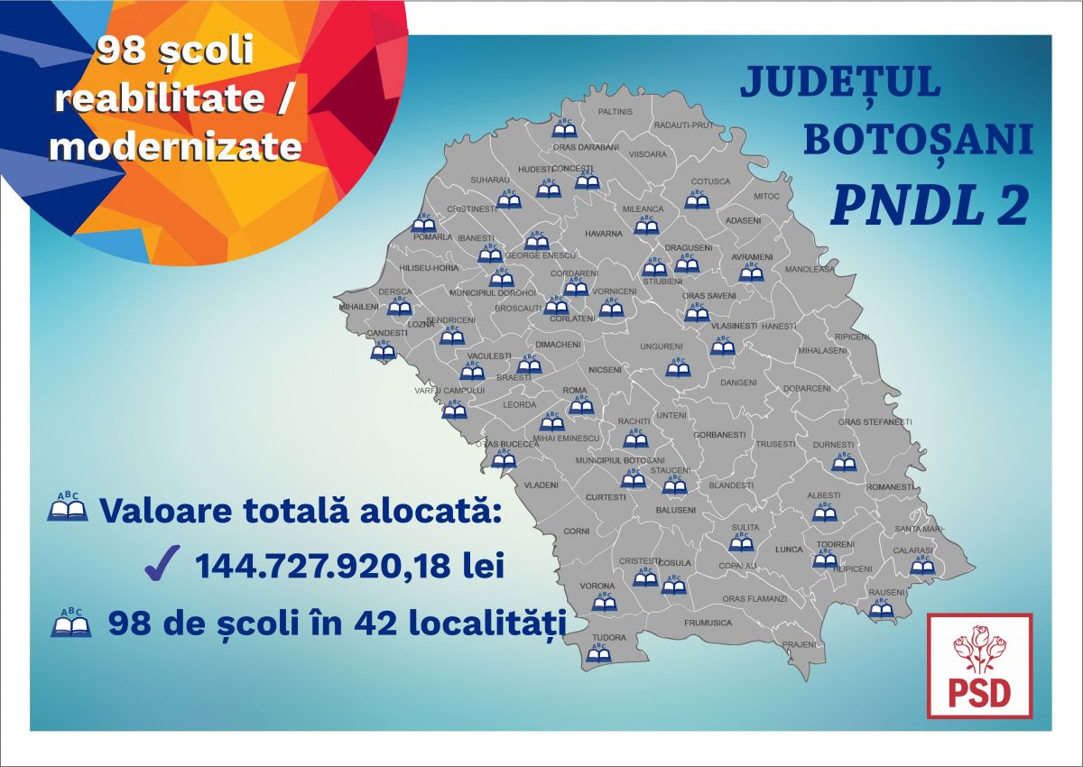 Localitățile unde vor fi construite/ reabilitate/ modernizate licee, școli și grădinițele sunt: Avrămeni, Albești, Brăești, Bucecea, Călărași, Concești, Cândești, Coșula, Cordăreni, Coțușca, Cristești, Cristinești, Darabani, Dersca, Dorohoi, Dobârceni, Drăgușeni, Durnești, Frumușica, George Enescu, Hudești, Havîrna, Hlipiceni, Ibănești, Manoleasa, Mihai Eminescu, Mihălășeni, Mileanca, Pomîrla, Răchiți, Răuseni, Roma, Românești, Stăuceni, Săveni, Suharău, Sulița, Știubieni, Șendriceni, Todireni, Tudora, Ungureni, Văculești, Vârfu Câmpului, Vlăsinești, Vorniceni, Vorona.