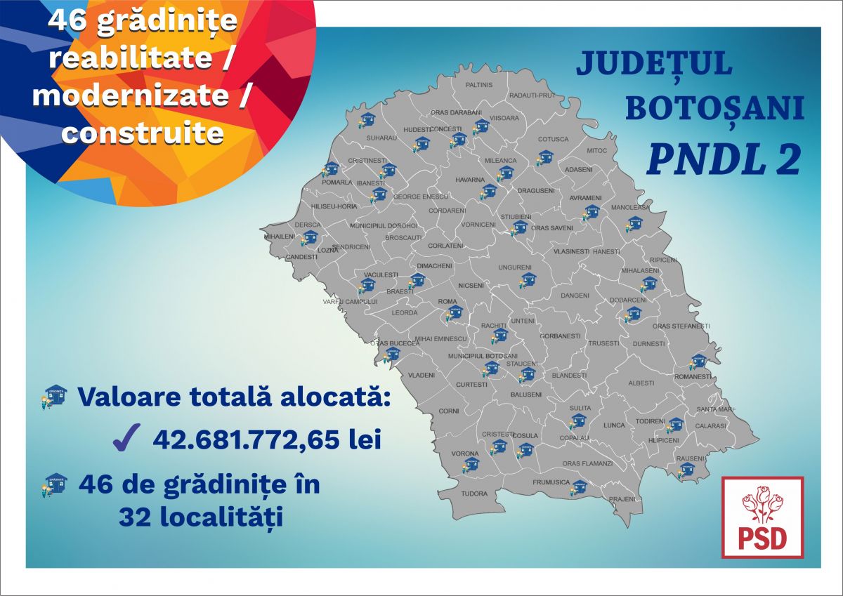 Președintele PSD Botoșani, Doina Federovici a anunțat astăzi, printr-un comunicat de presă, că județul Botoșani va beneficia de o finanțare în valoare de 41 de milioane de euro pentru următorii 3 ani în cadrul etapei a doua a Programului Național de Dezvoltare Locală pentru reabilitarea, modernizarea și construirea de grădinițe și școli.