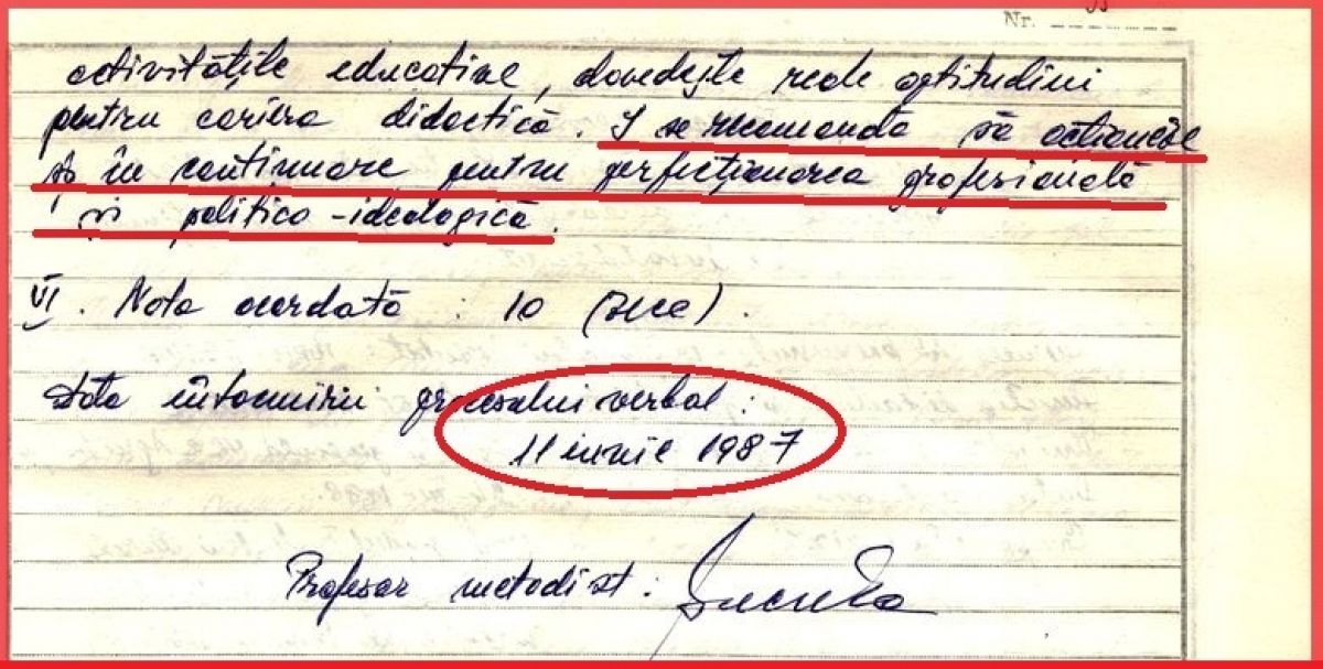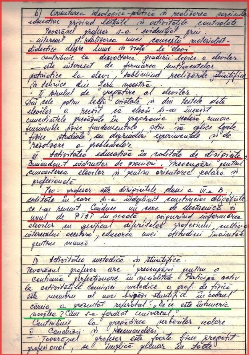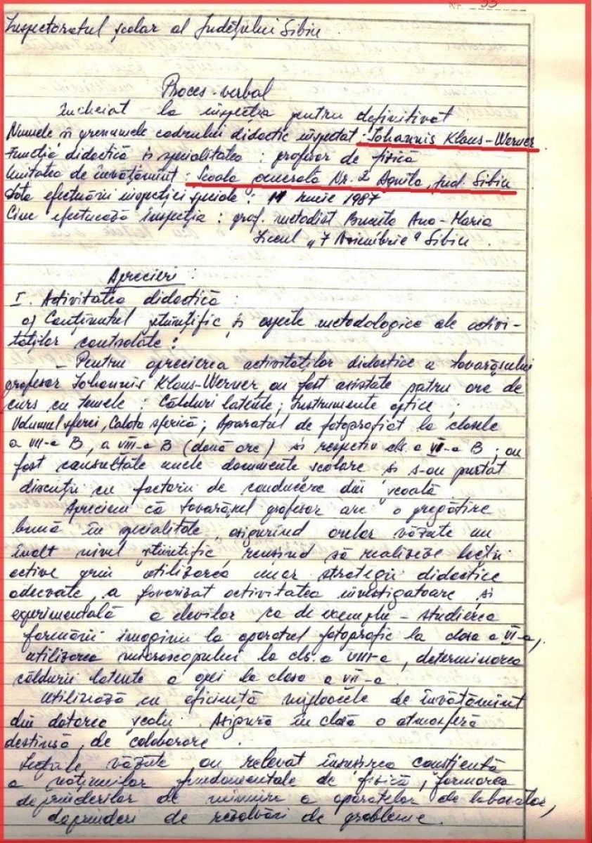 Inspectorul școlar îi dă calificativ maxim tovarășului profesor Iohannis căruia îi recomandă „să acţioneze şi în continuare pentru perfecţionarea profesională şi politico-ideologică” a elevilor!