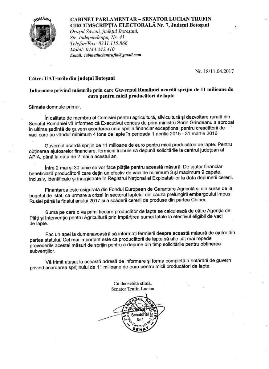 Recunosc faptul că acest ajutor exceptional este doar un mic pas spre creșterea competitivității în sectorul agricol în județul Botoșani. Fermierii noștri trebuie să capete încredere că pot accesa fonduri europene care, în timp, vor crește calitatea vieții și a condițiilor de trai din județul nostru în special în zonele rurale." a afirmat senatorul PSD, Lucian Trufin
