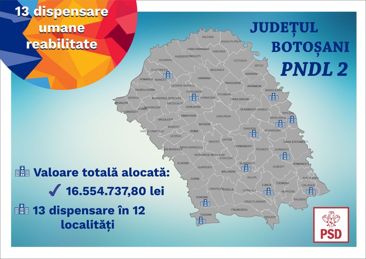 Președintele PSD Botoșani Doina Federovici a anunțat, printr-un comunicat de presă, că în următorii 3 ani, 13 dispensare medicale din 12 localități din județ vor fi reabilitate prin Programul de Dezvoltare Locală.