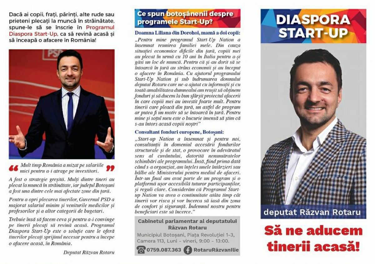 „În perioada următoare mă voi deplasa prin județ pentru a promova acest program și pentru a organiza dezbateri și întâlniri cu familiile botoșănenilor plecați la muncă în străinătate, pentru a le da detalii și informații în această privință. Trebuie să facem ceva și pentru a-i convinge pe tinerii plecați să revină acasă. Programul Diaspora Start-up este o soluție care le oferă tinerilor plecați sprijinul necesar pentru a începe o afacere acasă, în România. Mult timp România a mizat pe salariile mici pentru a-i atrage pe investitori. A fost o strategie greșită. Mulți dintre tineri au plecat la muncă în străinătate, iar județul Botoșani a fost unul dintre cele mai afectate județe din țară. Pentru a opri plecarea tinerilor, Guvernul PSD a majorat salariul minim și veniturile medicilor și profesorilor și a altor categorii de bugetari, însă acest lucru nu este suficient”, a declarat Răzvan Rotaru.