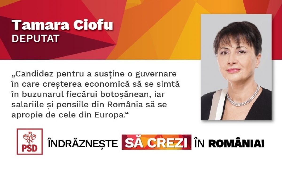 „Voi continua proiectele începute pentru municipiul Botoșani. Alături de colegii mei parlamentari de la PSD și al prim-ministrului Victor Ponta am reușit în municipiul Botoșani să începem construcția de locuințe pentru tineri în Șoseaua Iașului și cartierul de apartamente sociale în ANL Cișmea. De asemenea am obținut fonduri pentru modernizarea școlilor și grădinițelor. În același timp am dotat Spitalul Județean cu aparatură medicală nouă, am reabilitat secțiile de la Spitalul de Obstetrică și Ginecologie și am început demersurile pentru construcția unui spital nou pentru boli cronice. Totodată cheltuielile Compartimentului Primiri Urgențe al Spitalului de Copii Botoșani au fost preluate la Ministerul Sănătății și astfel unitatea sanitară a avut fonduri pentru achiziționarea de echipamente medicale. Anul trecut am primit de la Ministerul Dezvoltării două microbuze școlare noi pentru Liceul cu Program Sportiv și Clubul Sportiv. În urma deciziei fostului ministru Liviu Dragnea am obținut fonduri de la Compania Națională de Investiții pentru realizarea unei săli de atletism la Liceul Sportiv și modernizarea sălilor de sport de la Liceul Pedagogic „Nicolae Iorga” și Colegiul Național „Mihai Eminescu”, a declarat deputatul PSD Tamara Ciofu.