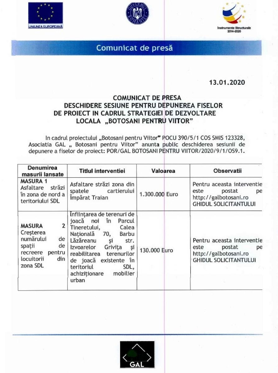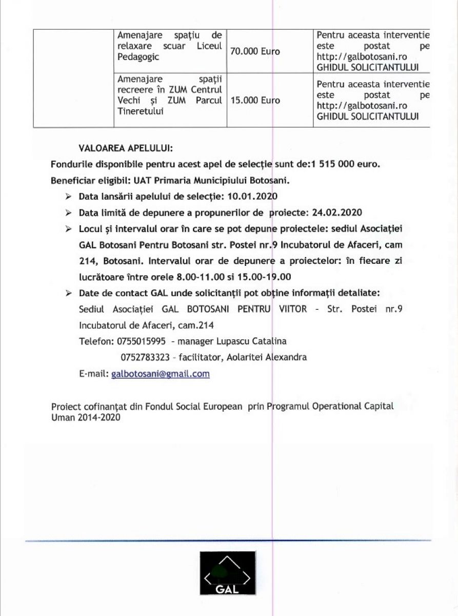 În cadrul proiectului „Botoșani pentru Viitor” POCU 390/5/1 COS SMIS 123328, Asociația GAL „Botoșani pentru Viitor” anunță public: