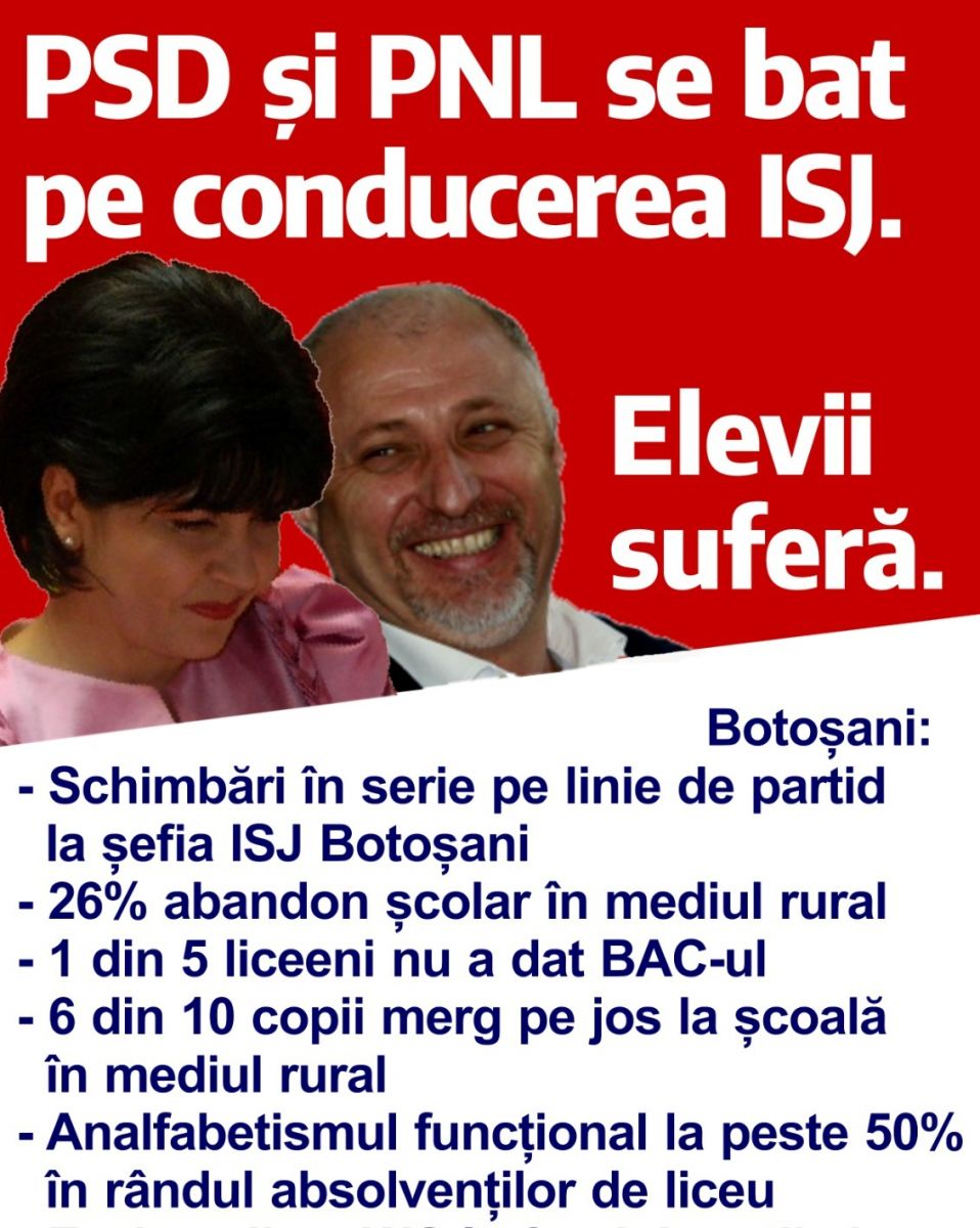 Situaţia este fără precedent în ultimii zeci de ani şi arată o reacţie de respingere a şcolarizării de către noile generaţii, iar efectele vor fi mai mult decât grave asupra societăţii româneşti. În tot acest timp, ce îi interesează pe guvernanţii coaliţiei de guvernare? Funcţiile de conducere din inspectoratul şcolar! În ultimele luni am asistat cu toţii la o continuă vânzoleală a inspectorilor doar pe criterii politice, cauzată de lupta pentru funcţii a social-democraţilor cu liberalii. Inspectori de toate disciplinele au fost înlocuiţi şi de câte două ori, iar totul a culminat cu schimbarea repetată a inspectorului şcolar general, fără nici cea mai mică explicaţie. Șeful educației botoșănene, care este în aceste zile şi preşedintele comisiei judeţene de bacalaureat, tocmai a fost schimbat când bacalaureatul şi evaluarea naţională sunt în plină desfăşurare, iar sursele spun că de vină ar fi fost ”incompatibilitatea” dintre inspectorul Ada Macovei şi preşedintele PSD şi şeful CJ-ului, Doina Federovici.