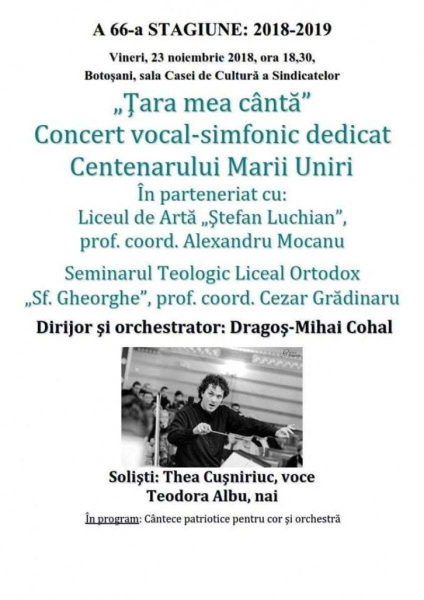 Concertul vocal-simfonic "Țara mea cântă", care va avea loc astăzi, la ora 18.30, în sala Casei de Cultură a Sindicatelor Botoșani , aduce pe aceeași scenă corurile Liceului de Artă "Ștefan Luchian" (prof. coord. Alexandru Mocanu) și al Seminarul Teologic Liceal Ortodox "Sf. Gheorghe" din Botoșani (prof. coord. Cezar Grădinaru).