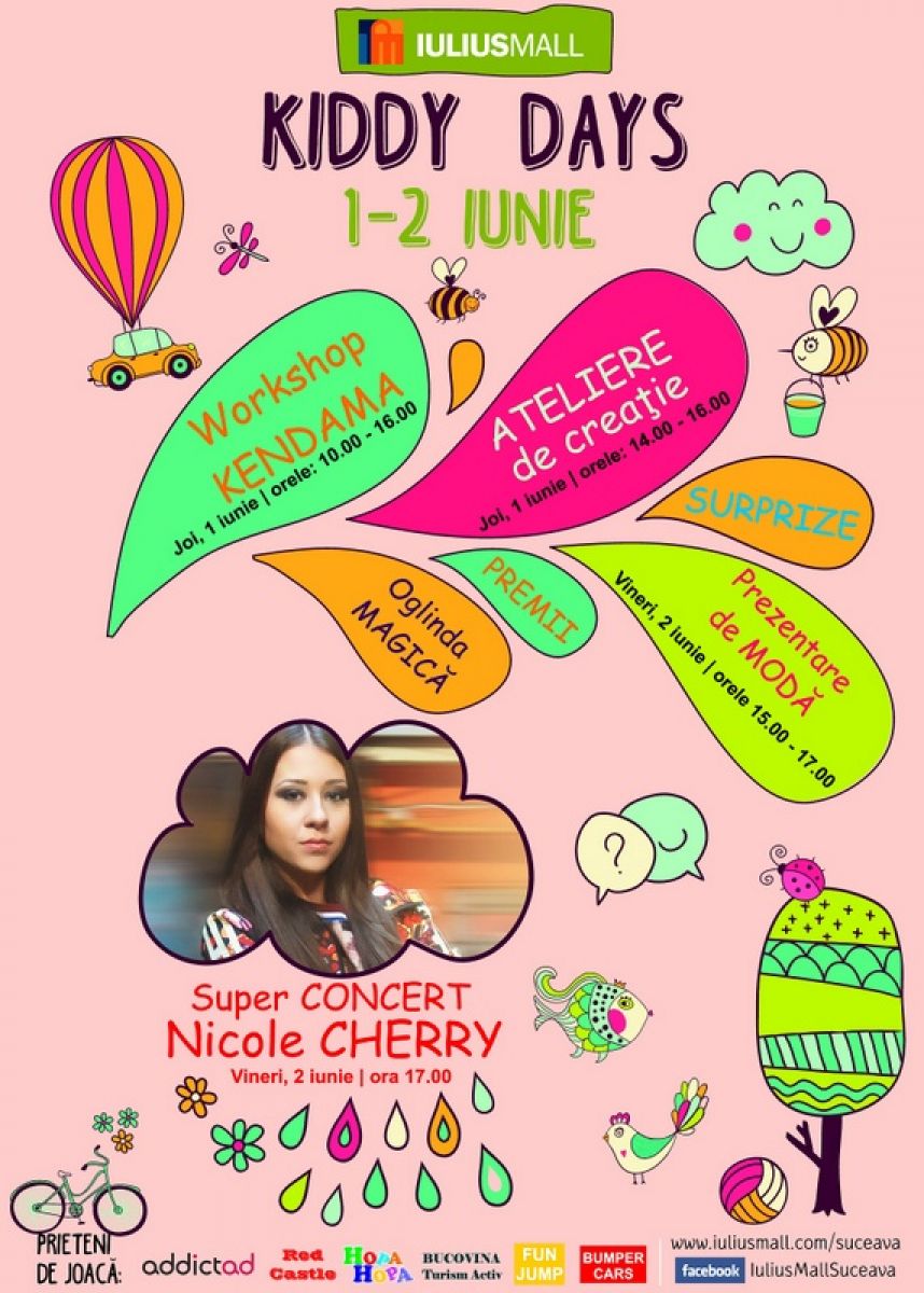 De la ora 17.00, Iulius Mall Suceava le oferă tuturor ștrengarilor un cadou muzical cu totul special și îi invită la un concert al îndrăgitei artiste Nicole Cherry. Ritmurile și versurile cunoscute de copiii și tinerii din toată țara se vor auzi la etajul Iulius Mall Suceava, spre încântarea tuturor sărbătoriților.