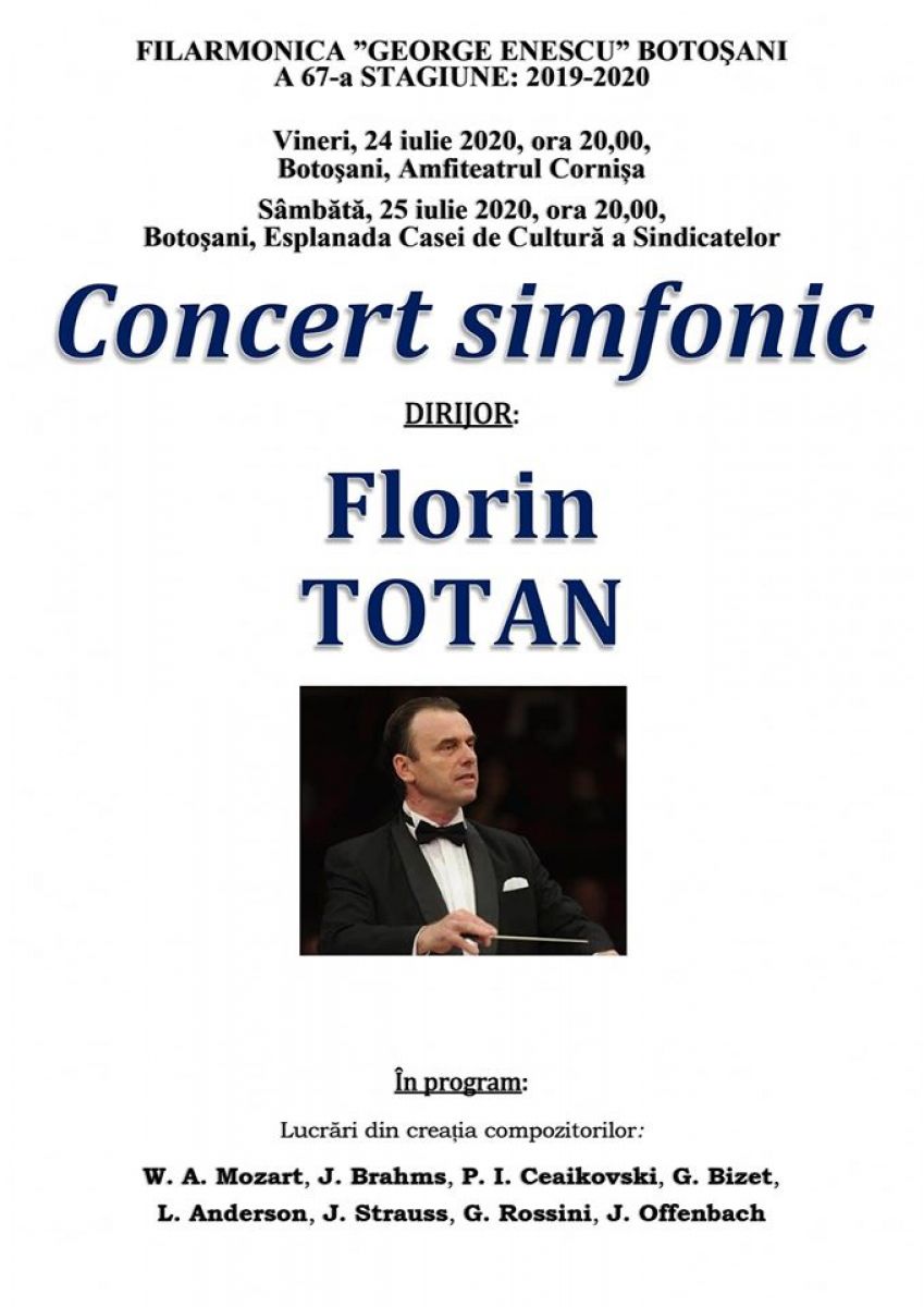 Vineri, 24 iulie, dar și sâmbătă, 25 iulie, Filarmonica ”George Enescu” Botoșani va organiza două concerte simfonice.