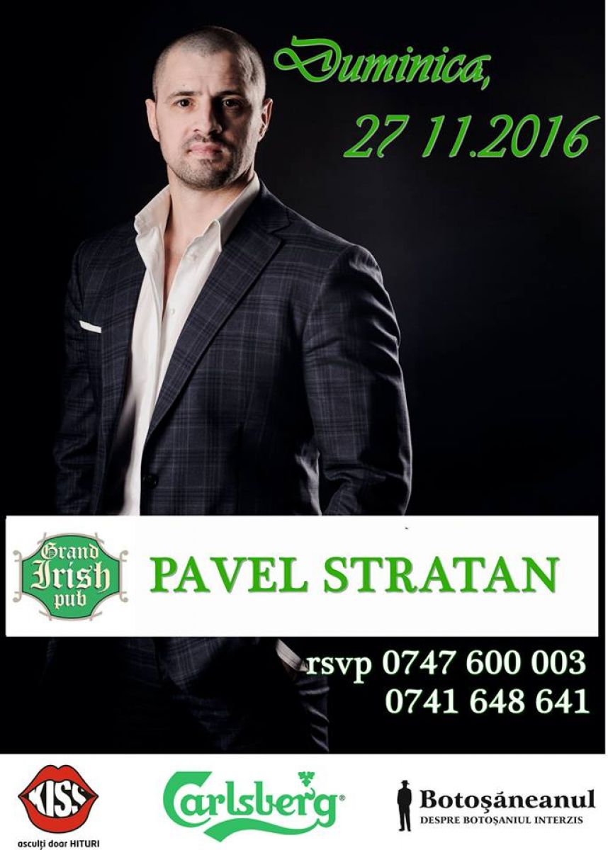 Week-end-ul de spectacole continuă duminică la Irish cu recitalului lui Pavel Stratan, artistul din Republica Moldova care a făcut furori în România acum mai bine de un deceniu cu albumul „Amintiri din copilărie”. Preţul biletului este tot de 15 lei.