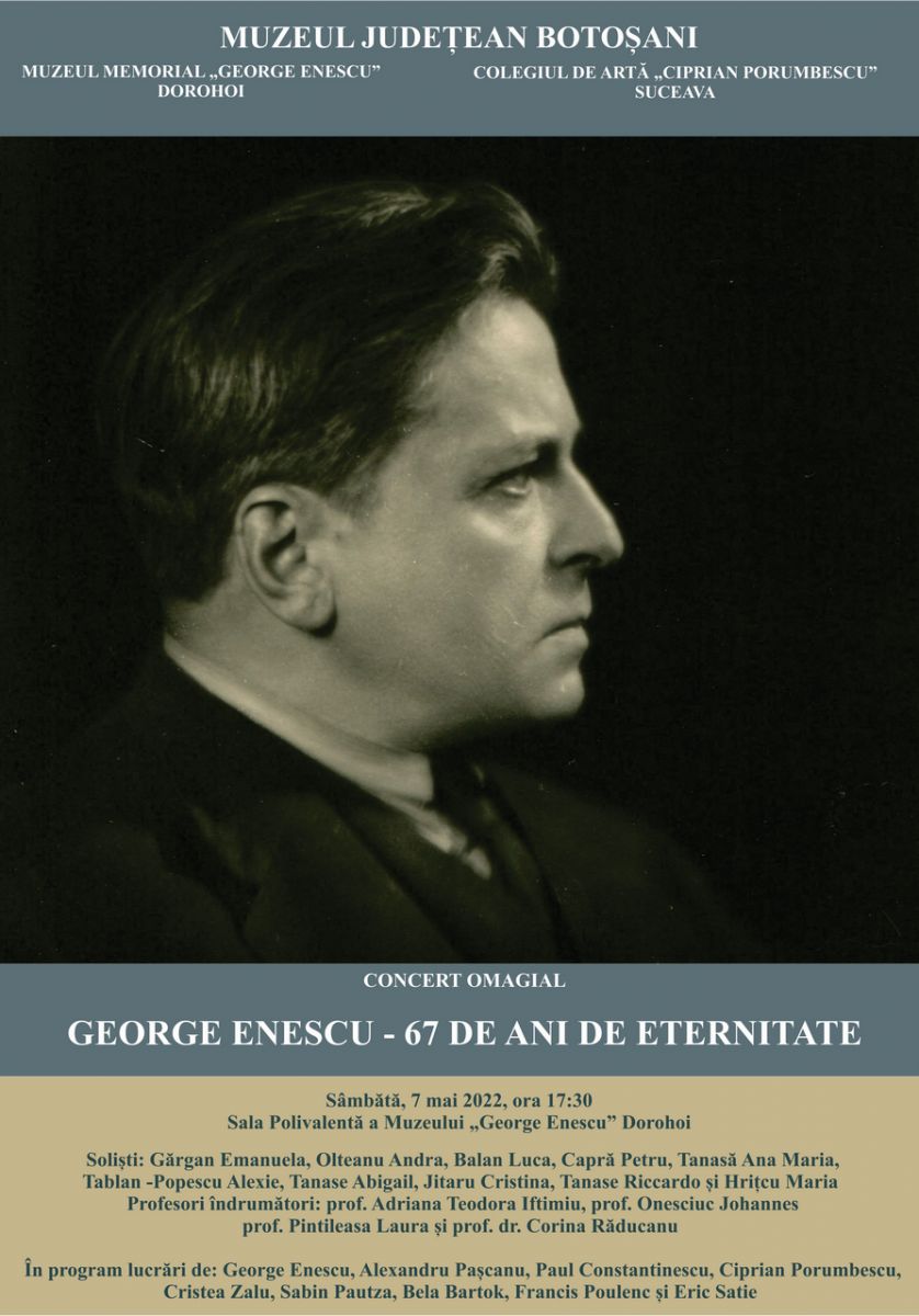 Muzeul Memorial „George Enescu” Dorohoi organizează sâmbătă, 7 mai 2022, de la ora 17.30, concertul omagial ”George Enescu – 67 de ani de eternitate”.
