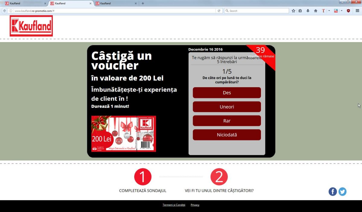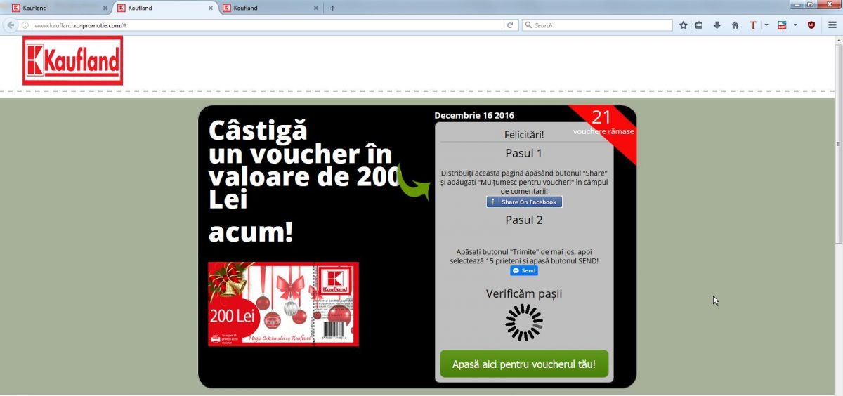 Concursul fals este reprezentat de un chestionar care îi invită pe cei ce îl accesează să distribuie informația în platformele sociale și să răspundă la 5 întrebări despre Kaufland cu promisiunea că vor beneficia la final de un voucher în valoare de 200 de lei, după completarea datelor personale.