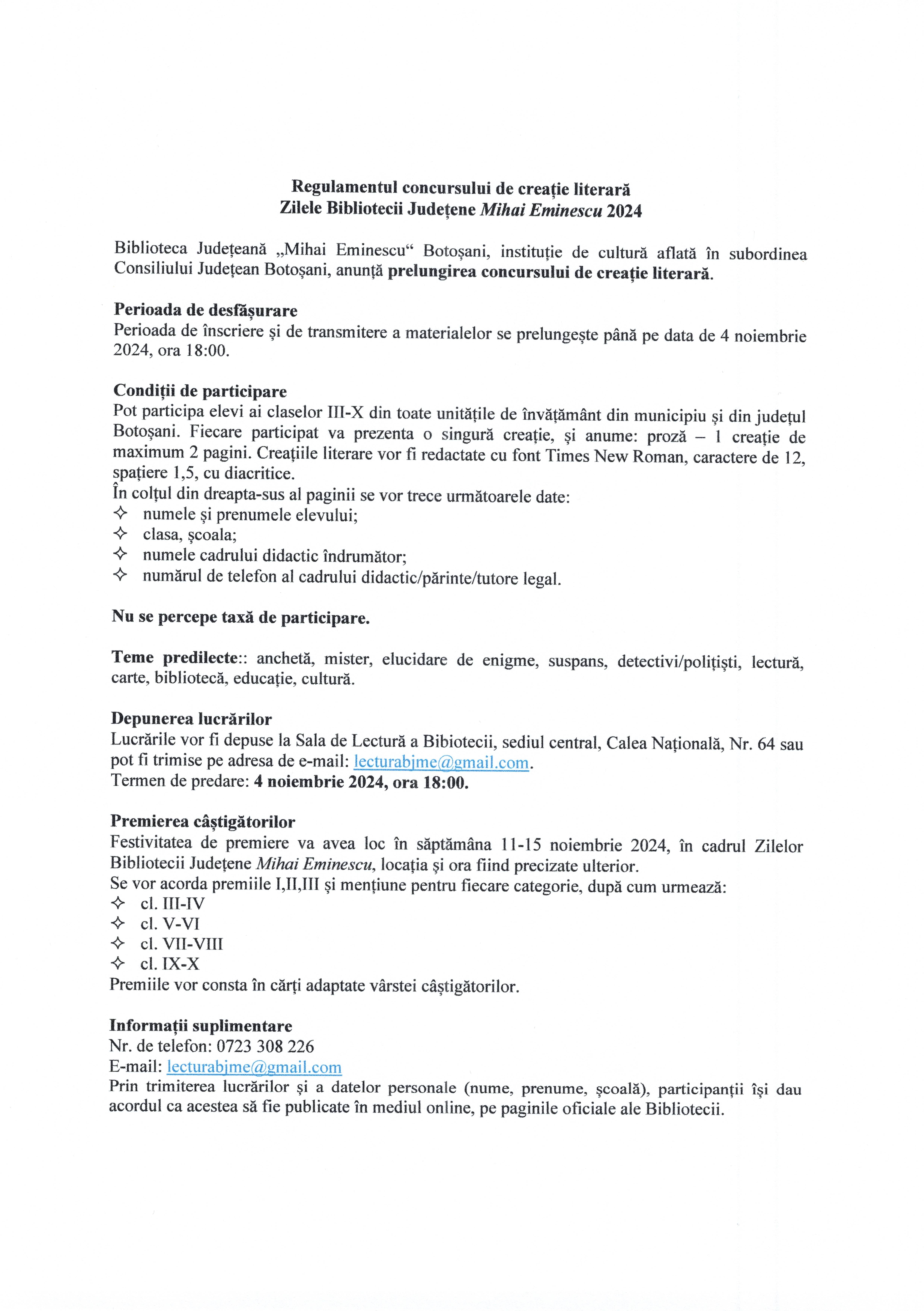 Biblioteca Județeană „Mihai Eminescu“ Botoșani, instituție de cultură aflată în subordinea Consiliului Județean Botoșani, organizează Concursul de creație literară cu următoarea tematică: anchetă, mister, elucidare de enigme, suspans, detectivi/polițiști, lectură, carte, bibliotecă, educație, cultură.