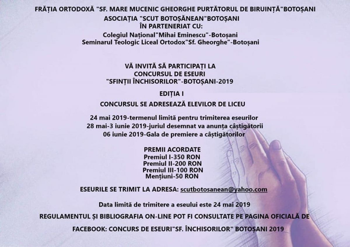 Colegiul Național „Mihai Eminescu”, Frăția Ortodoxă „Sf. Mare Mucenic Gheorghe Purtătorul de Biruință” – filiala Botoșani și asociația „Scut botoșănean” anunță lansarea concursului interliceal de eseuri „Sfinții Închisorilor”, Botoșani, 2019.